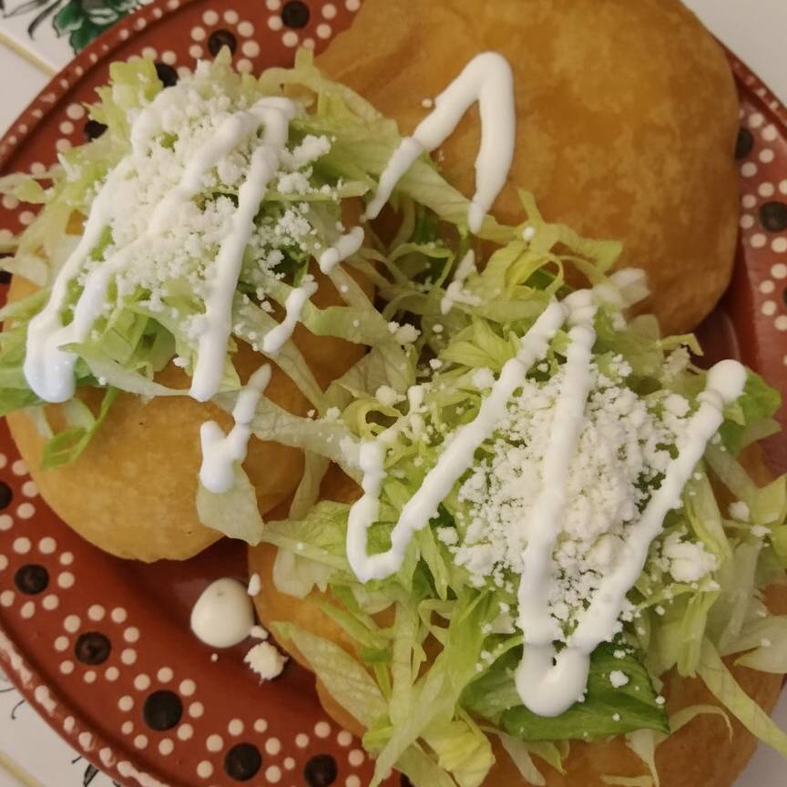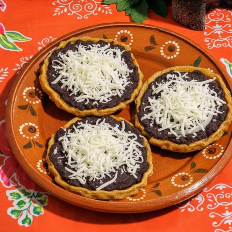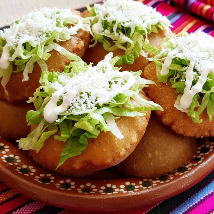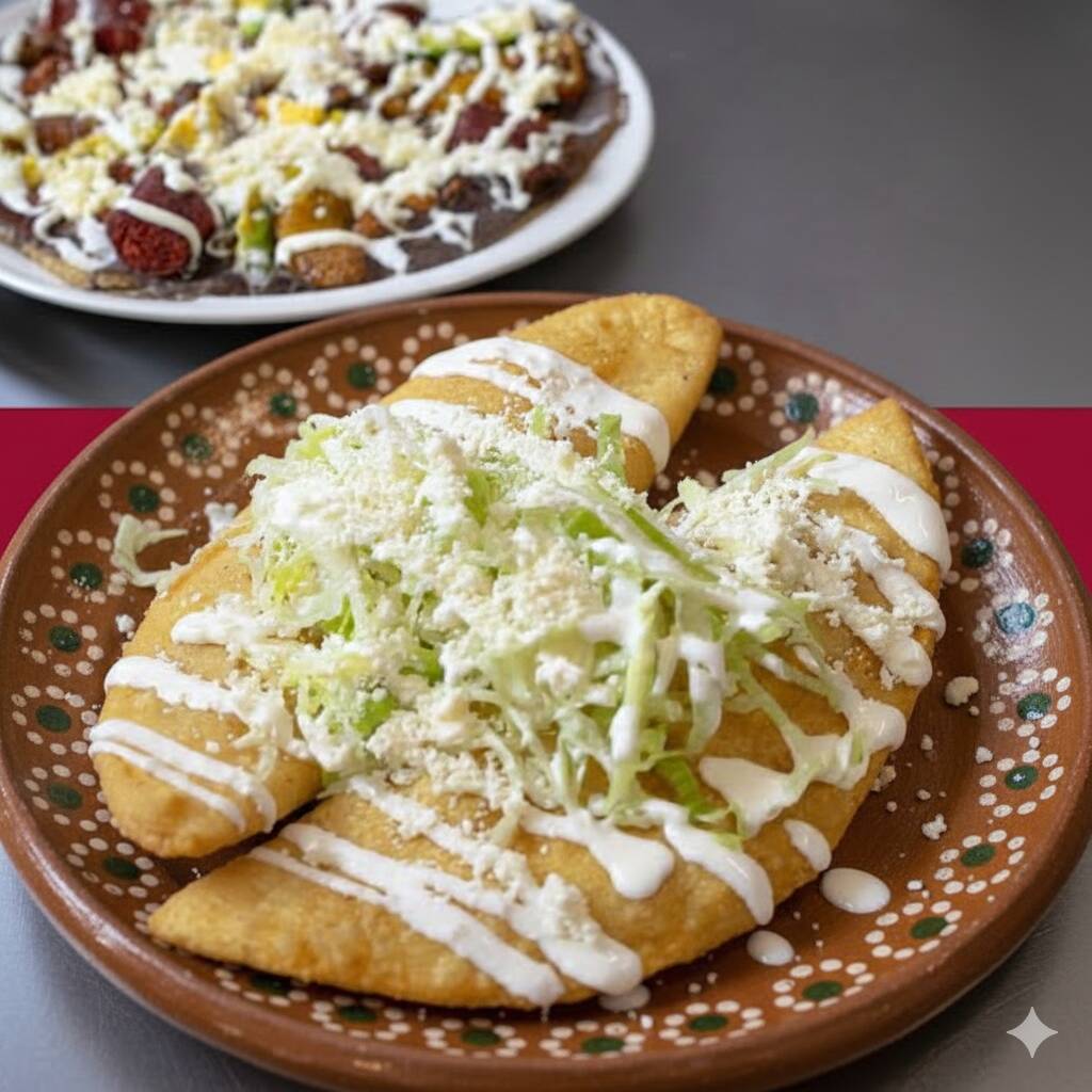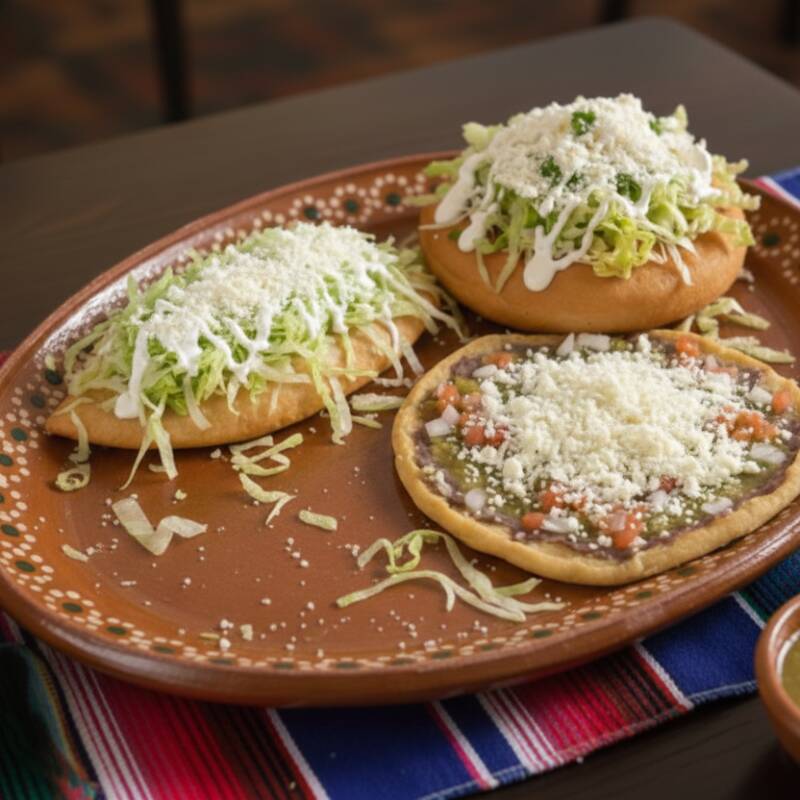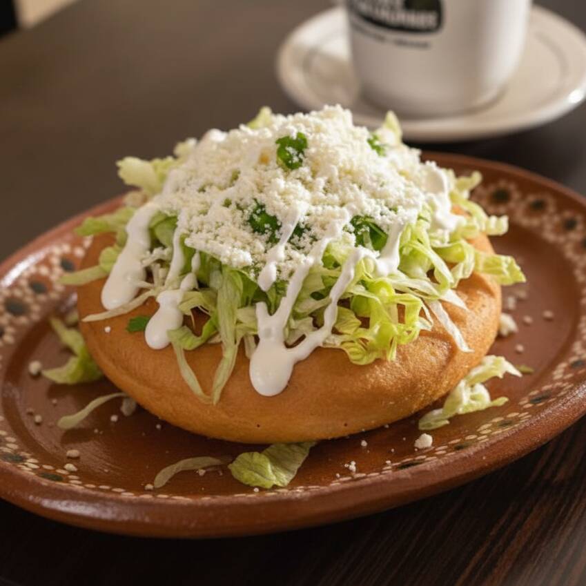 Gordita de masa rellena de frijoles bien sazonados, tapada con otra capa de masa y doradita hasta quedar crujiente por fuera. Se sirve con lechuga fresca, crema y queso rallado. Un antojito tradicional, sencillo y lleno de sabor casero.
