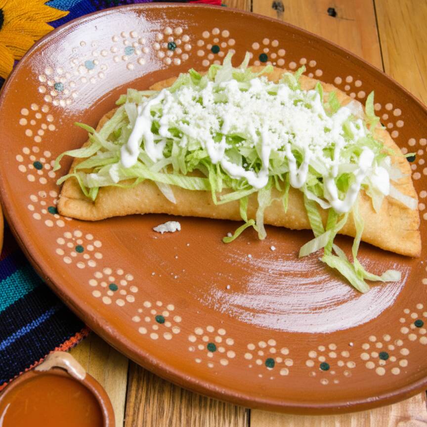Empanada hecha con masa, rellena de papa. Lleva lechuga fresca, crema y queso rallado por encima. Un antojito sencillo pero con mucho sabor, perfecto pa’ consentirse.
