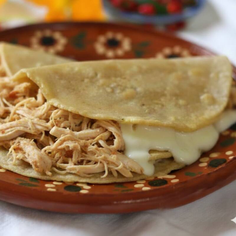 Tortilla al comal, rellena con queso de hebra derretido y pollo guisado con jitomate y cebolla. Bien calientita, jugosa y con el toque casero que la hace irresistible.