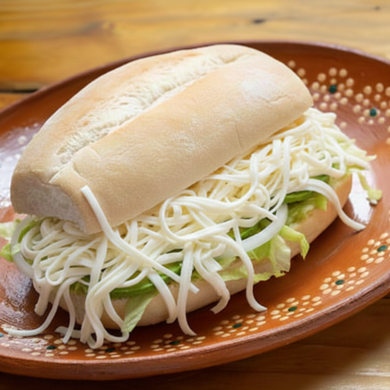 Queso de hebra fresco, con frijoles refritos, lechuga, jitomate y mayonesa, servido en pan suave. Sencilla, fresca y con ese sabor casero que se antoja a cualquier hora.