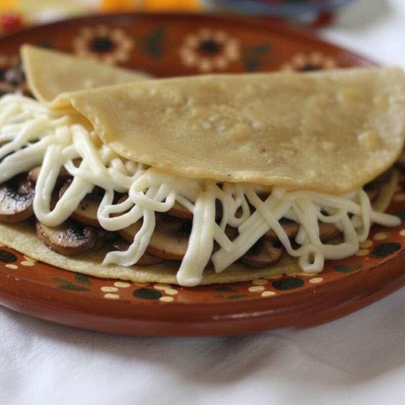 Tortilla doradita rellena de queso fundido y champiñones salteados con un toque de cebolla y sazón casera. Perfecta para esos antojos que no fallan.
