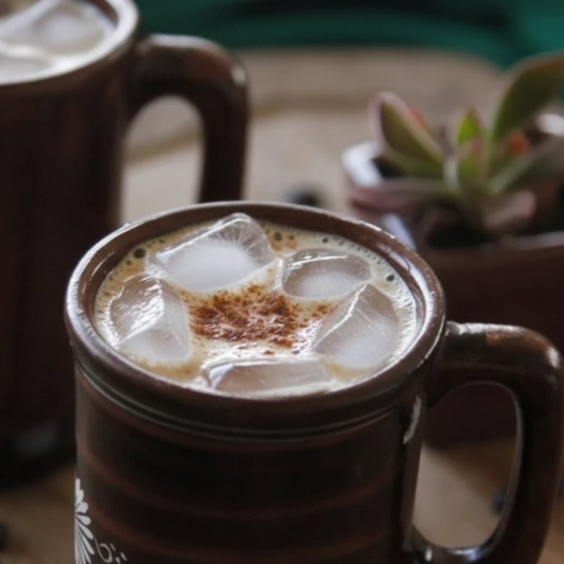 Café recién preparado, mezclado con leche y endulzado con azúcar. Bien frío, cremoso y refrescante, ideal para acompañar tus antojitos o para el antojo de algo dulce con café. Hecho al momento, sabor casero.