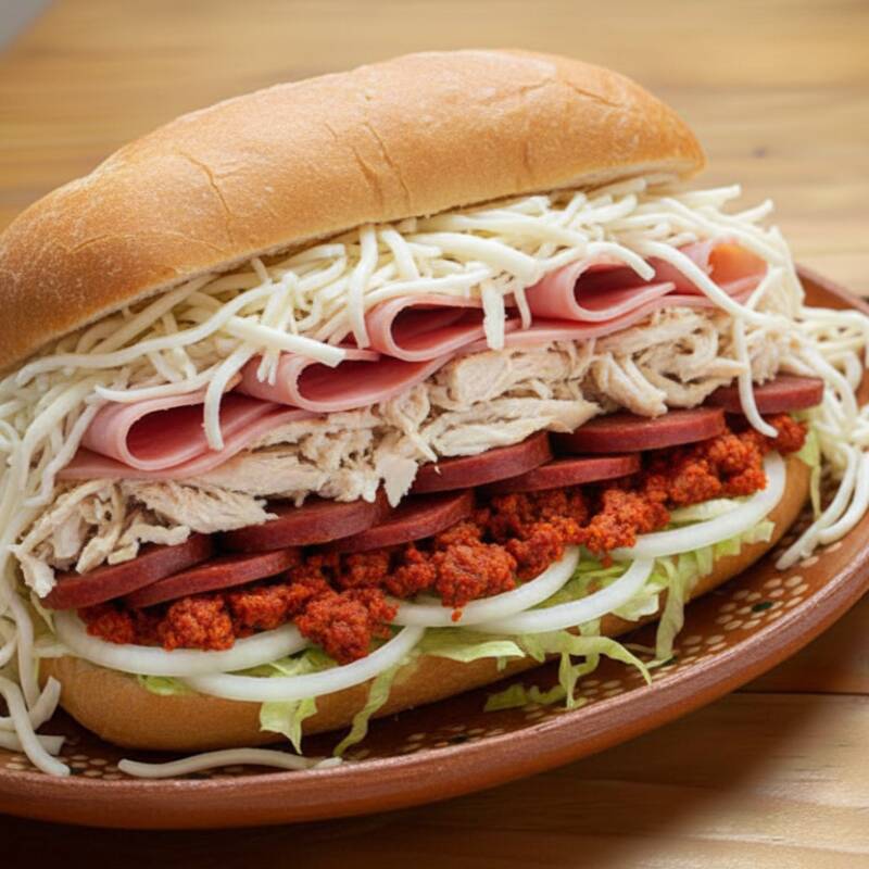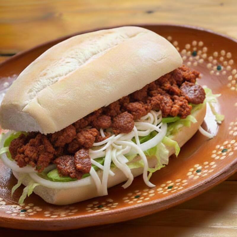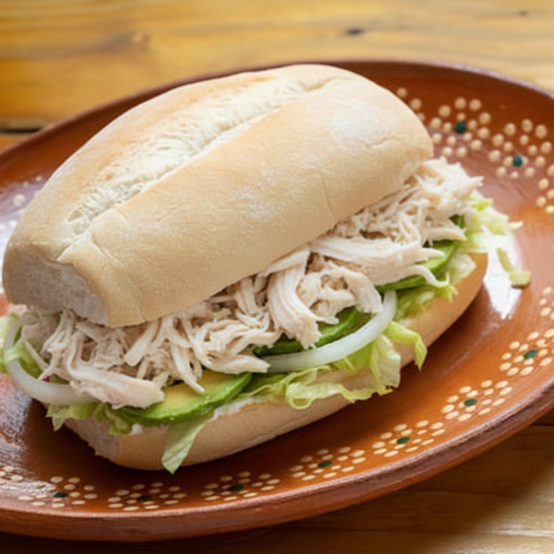 Pollo deshebrado y bien sazonado, servido en pan suave con frijoles, lechuga, jitomate, mayonesa y un toque de casa. Un clásico que llena y consiente.