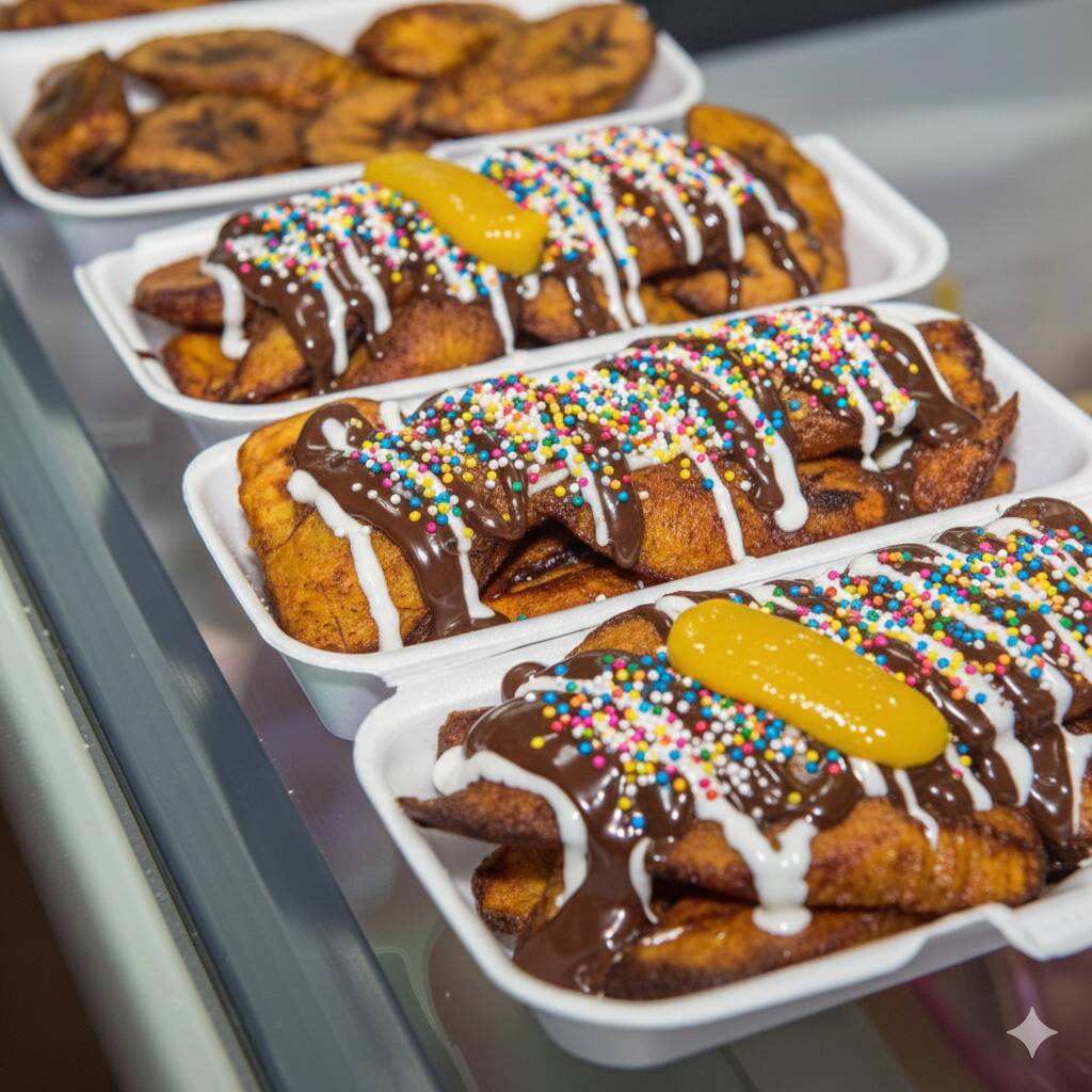 Plátano maduro frito, suave por dentro y crujiente por fuera, acompañado de crema, leche condensada (lechera) y queso rallado. El toque perfecto de dulce y salado, ideal para un antojo que te consienta.