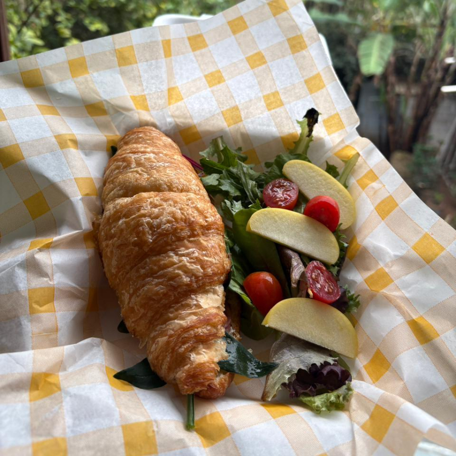 Croissant hojaldrado relleno de jamón, queso de cabra suave, espinacas y tomates cherry. Una combinación gourmet y deliciosa.