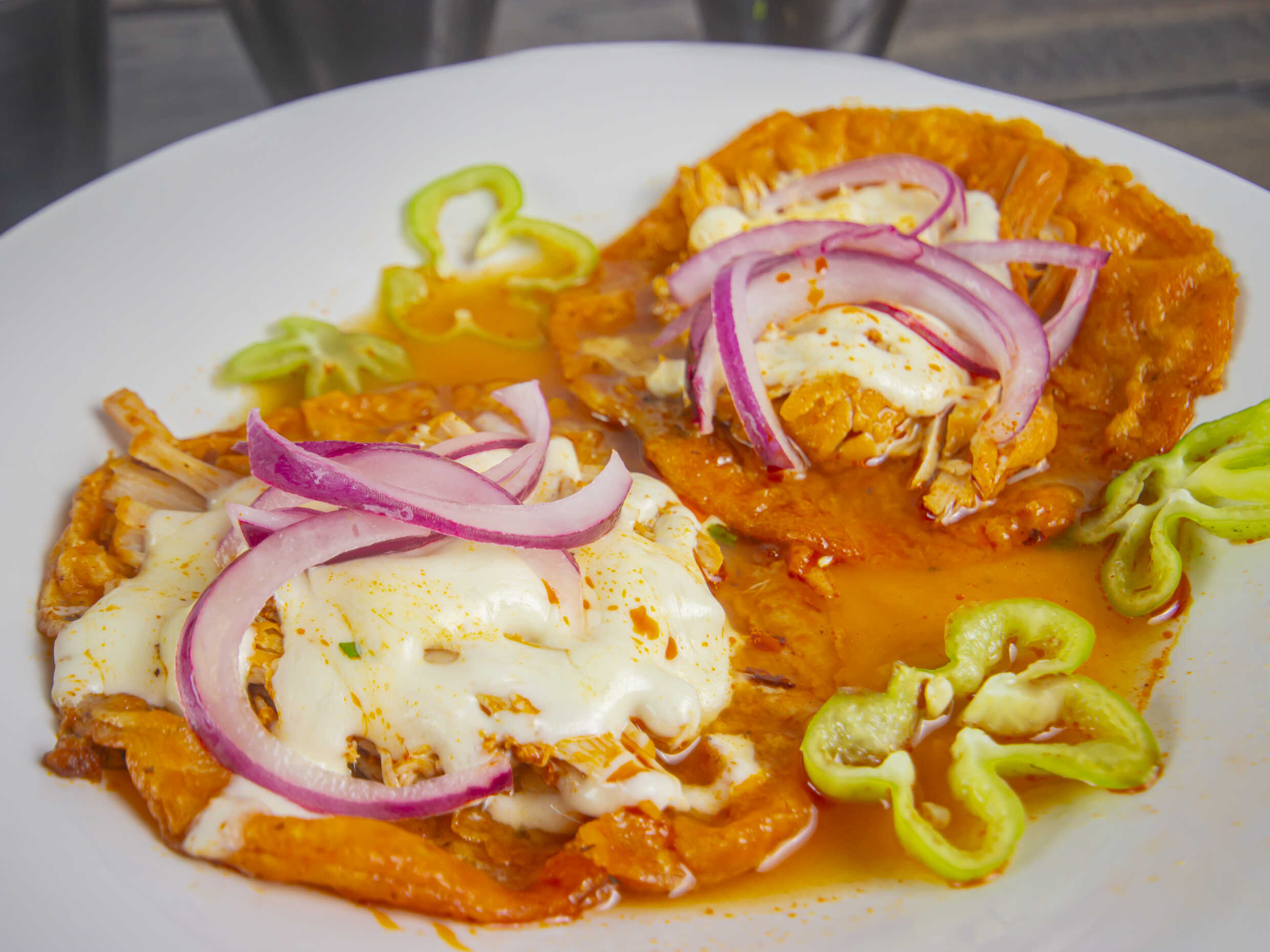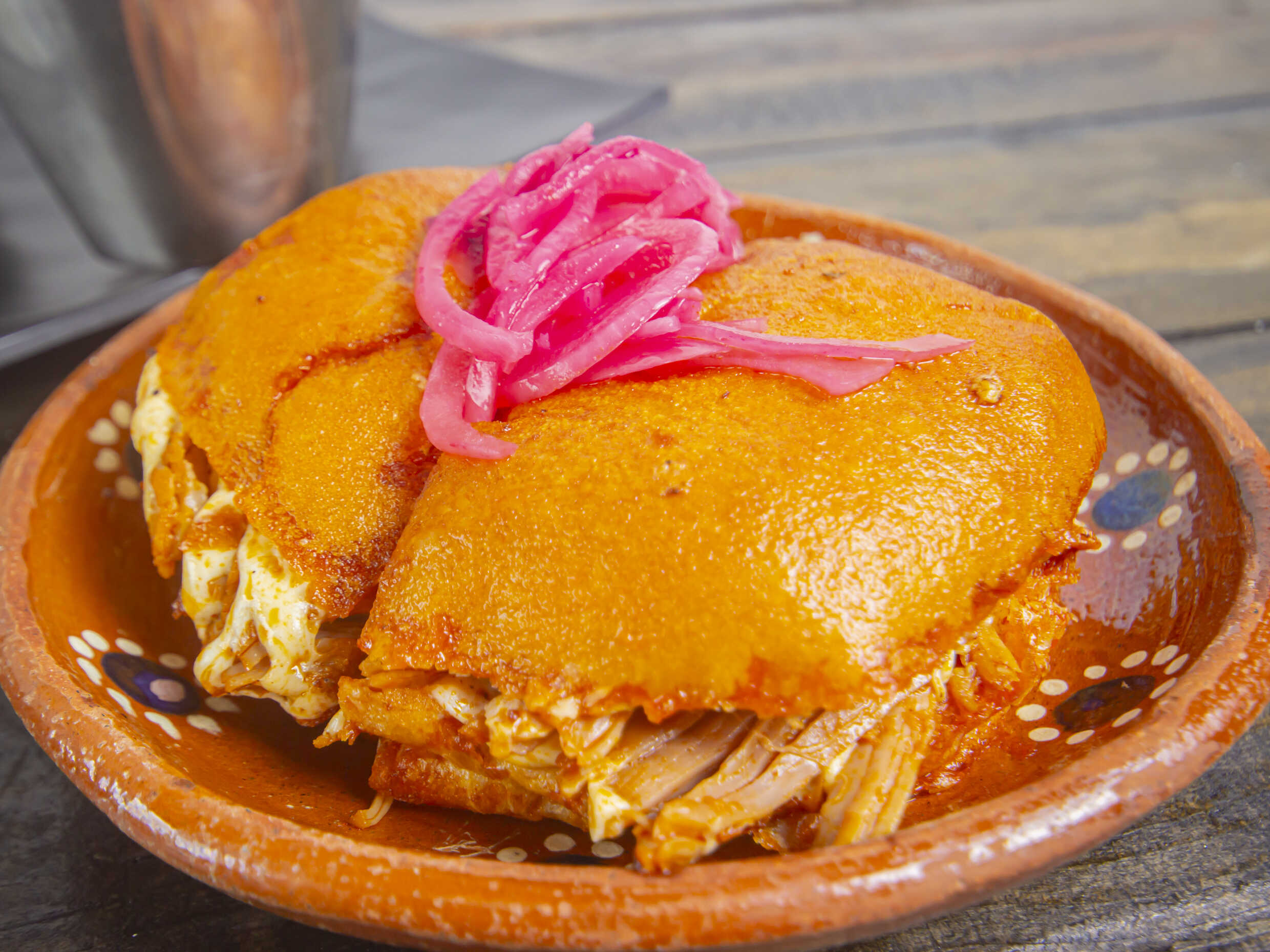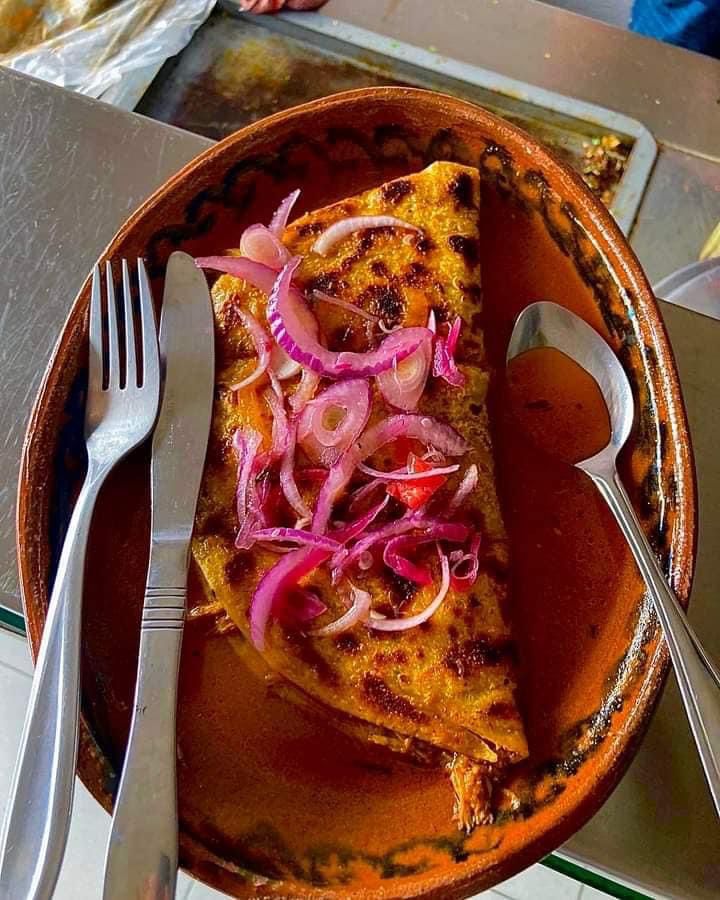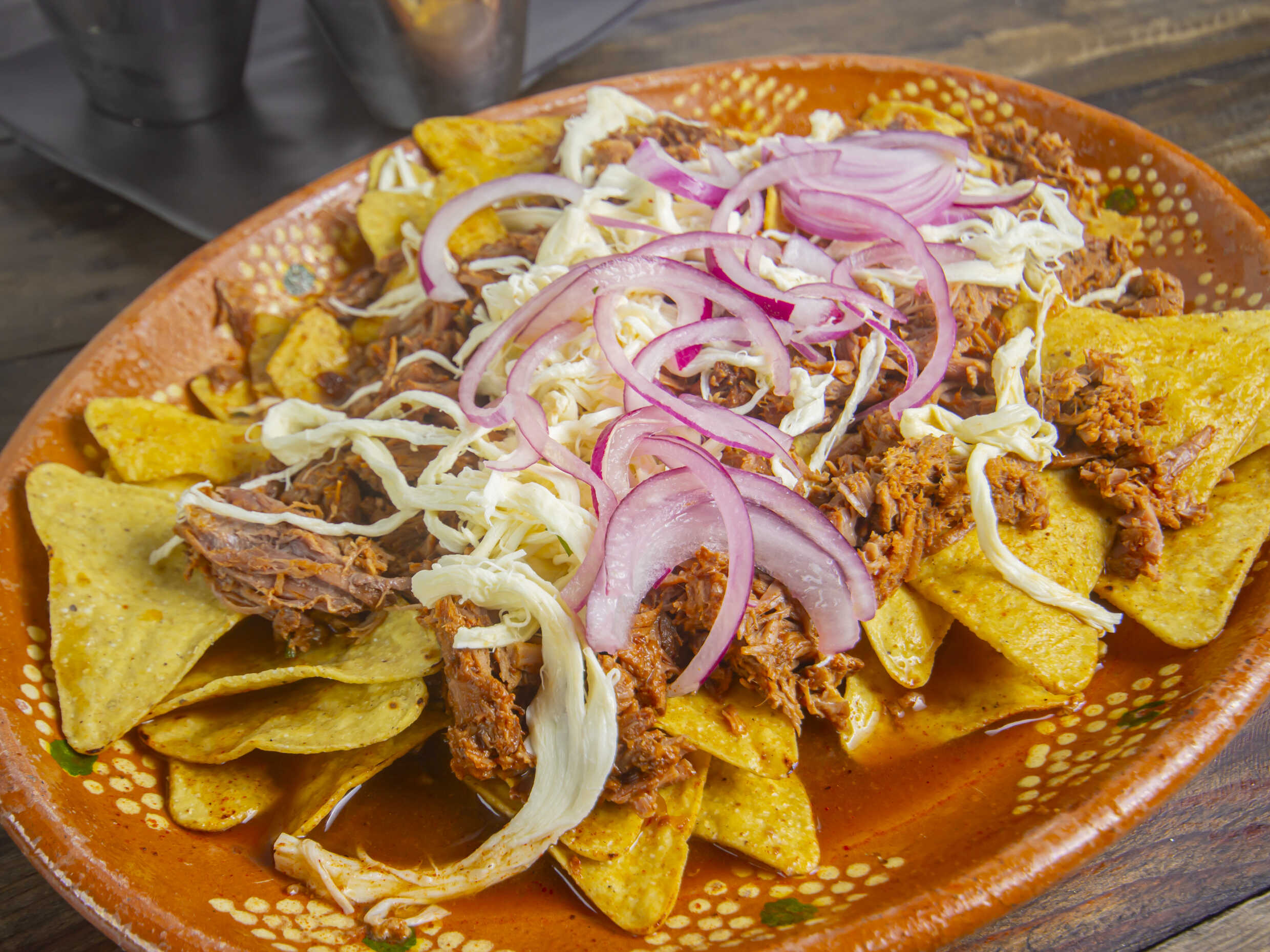 Queso fundido con carne de cochinita (la puedes pedir bañada en su jugo)