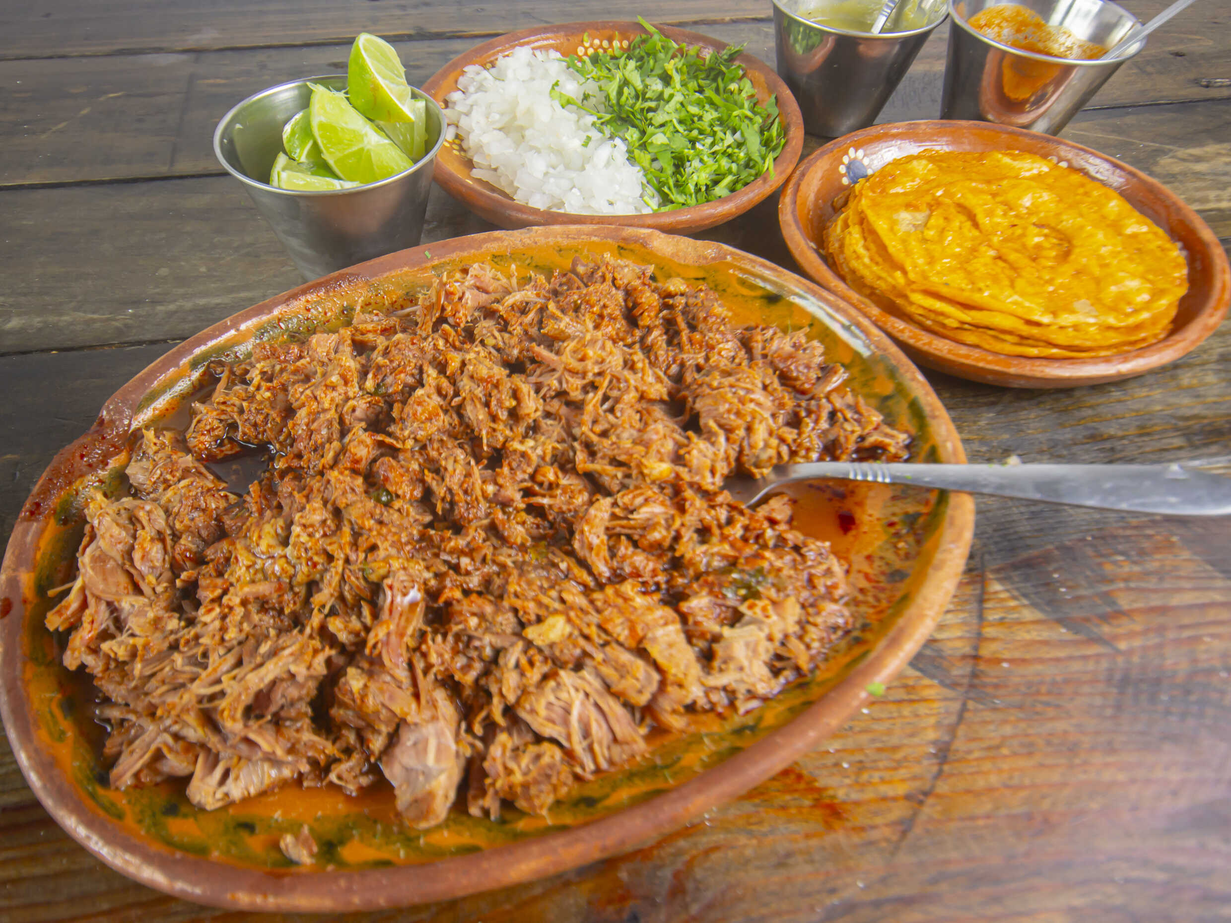 Incluye tortillas, cebolla morada, salsas y cuarto de jugo de la carne de cochinita