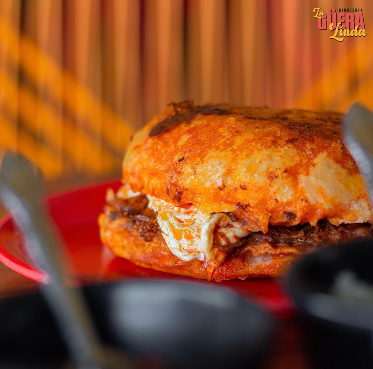 hamburguesa en pan artesanal con deliciosa birria de res y queso de hebra acompañada de papa estilo chip