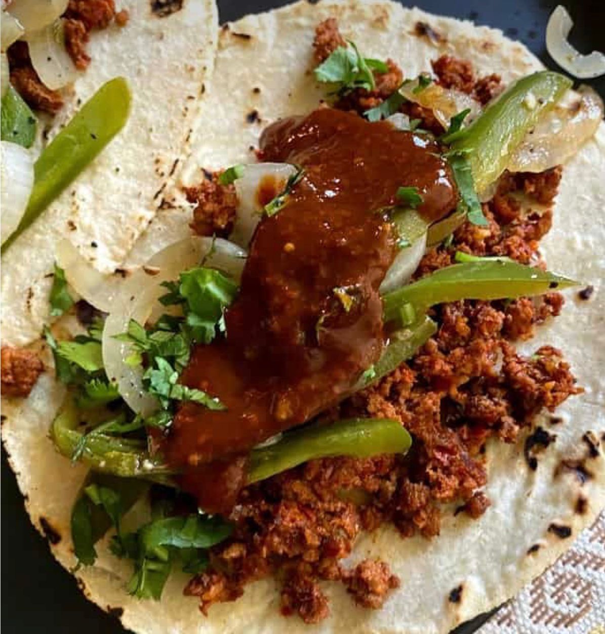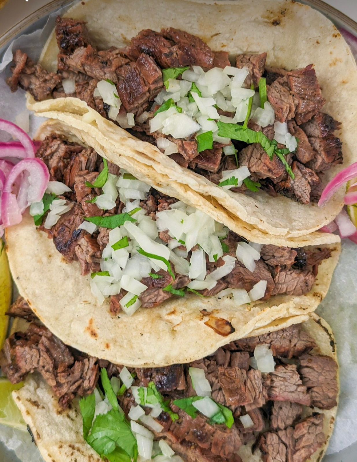 Con carne asada y longaniza, con cebolla, cilantro y salsa todo por separado