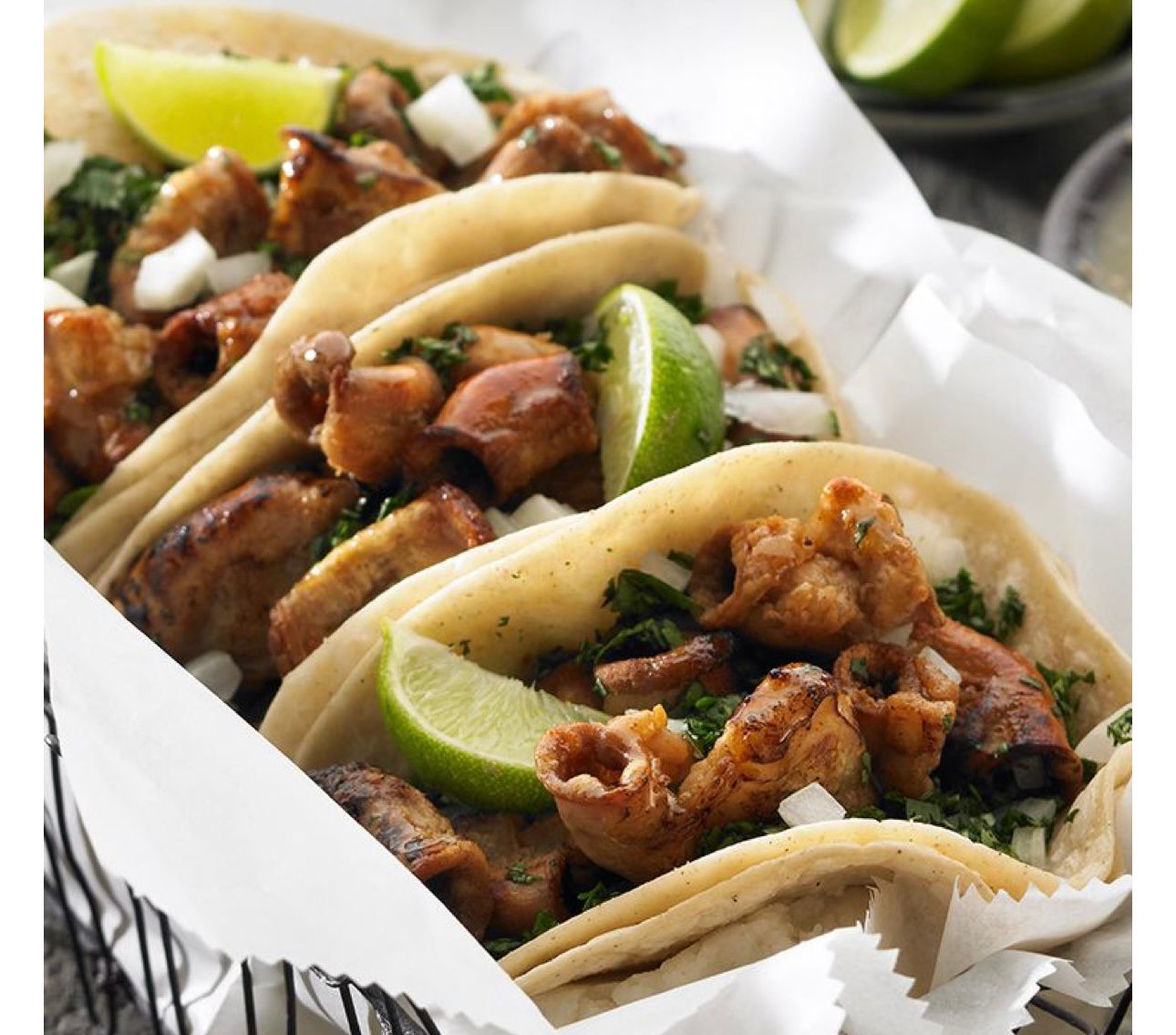 Medio kilo de tripa dorada con tortillas, salsa, cilantro y cebolla.