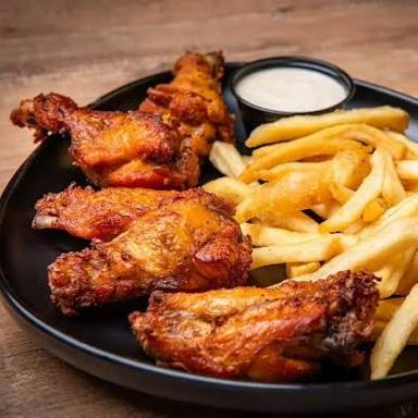 8 piezas de alitas bañadas en la salsa de tu elección y acompañado de papas a la francesa