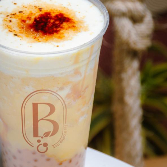 Mezcla de cúrcuma, anís estrella, gengibre a base de leche y tapioca negra.