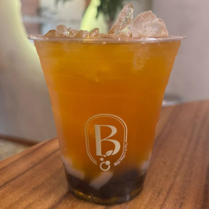 Bebida liquida fria con te oolong, jarabe de mango y tapioca negra.