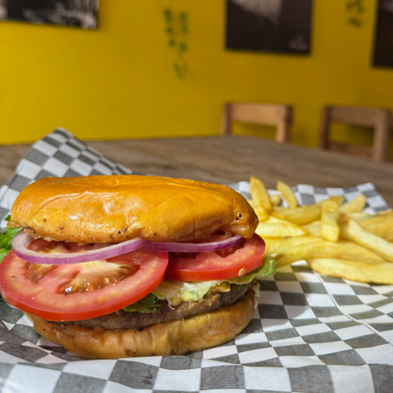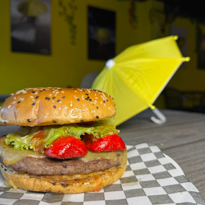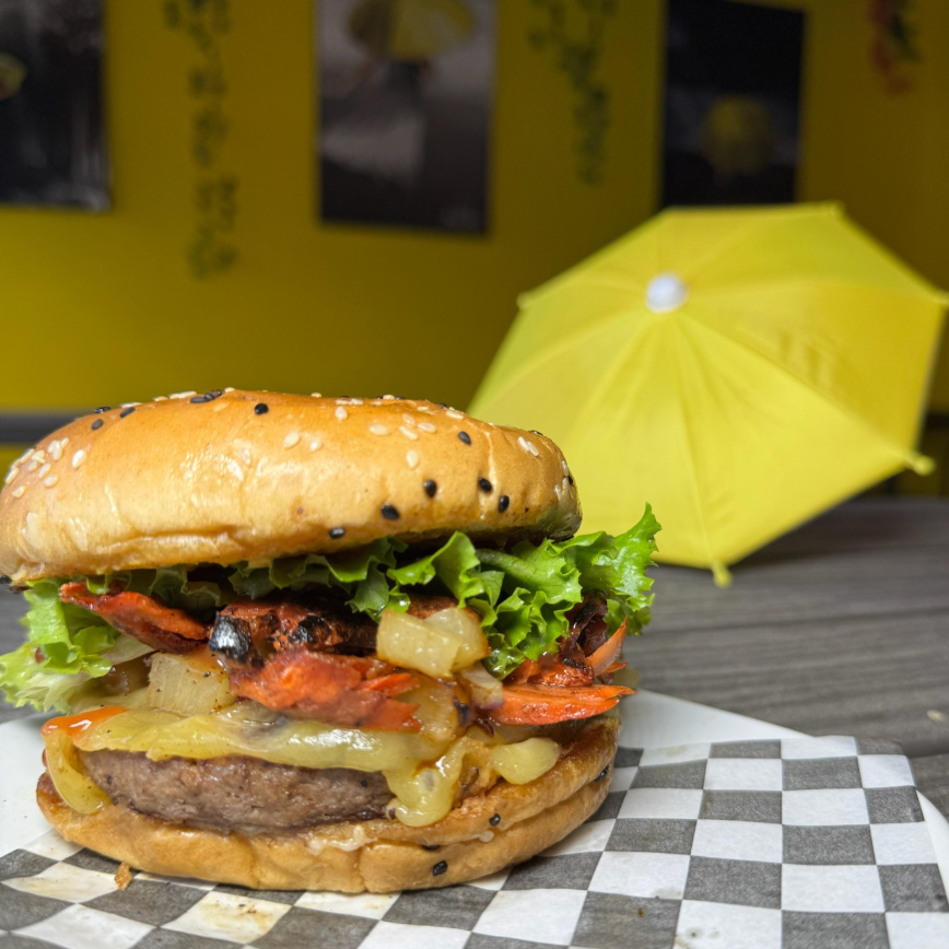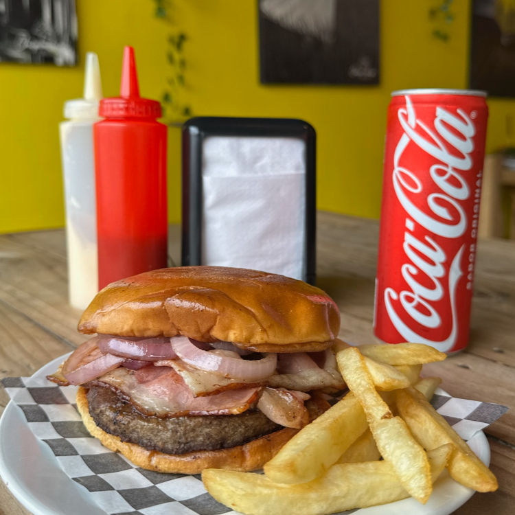 Doble carne SIRLOIN, tocino, queso manchego, vegetales y cebolla caramelizada.