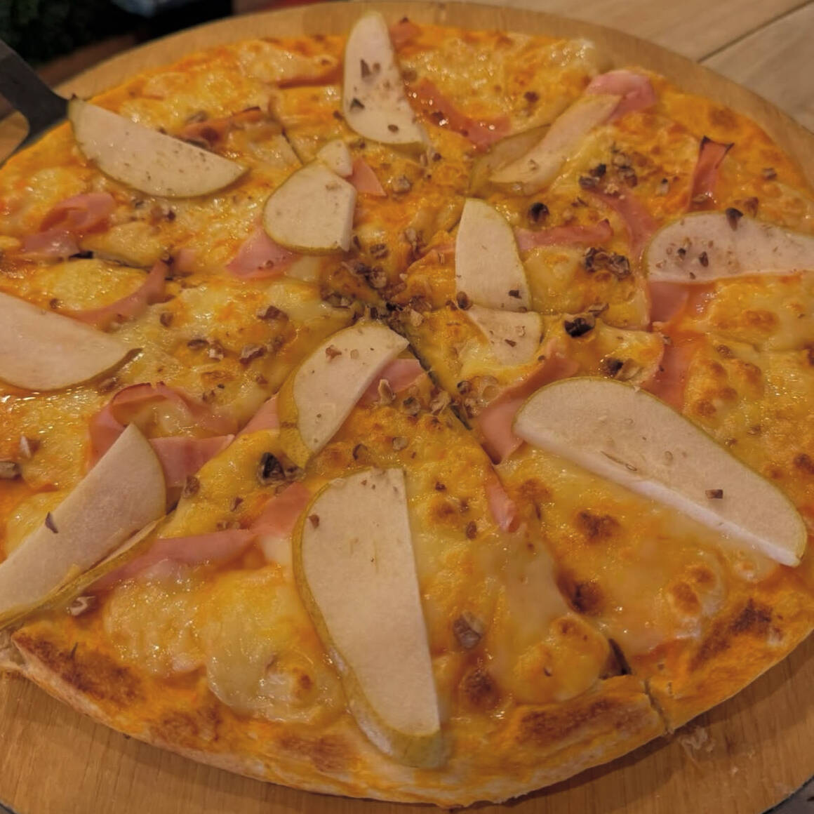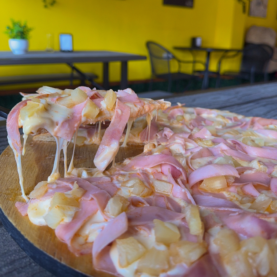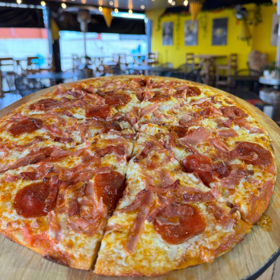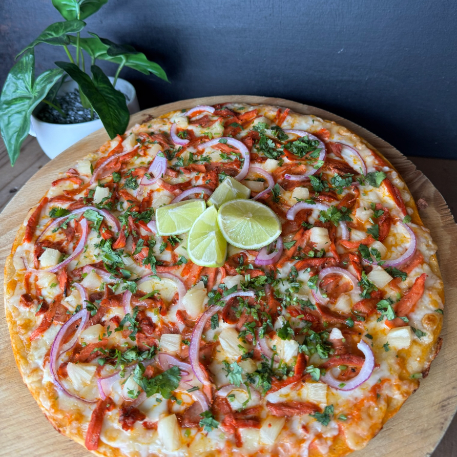 Carne SIRLOIN, carne de pastor, queso manchego, vegetales, piña asada y cebolla caramelizada.