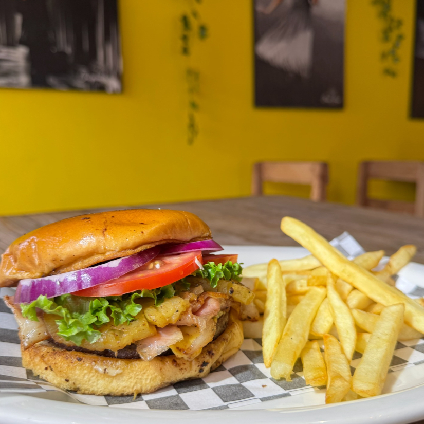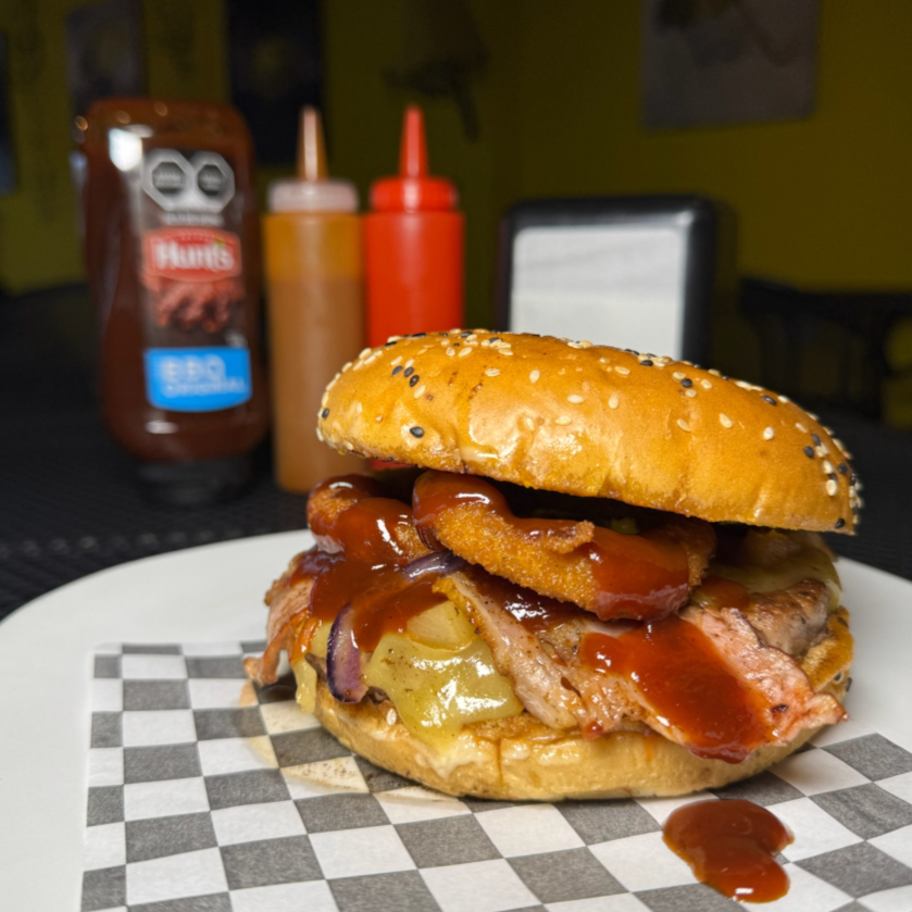 Carne SIRLOIN bañada en salsa BBQ, tocino, queso gouda, piña asada y aros de cebolla