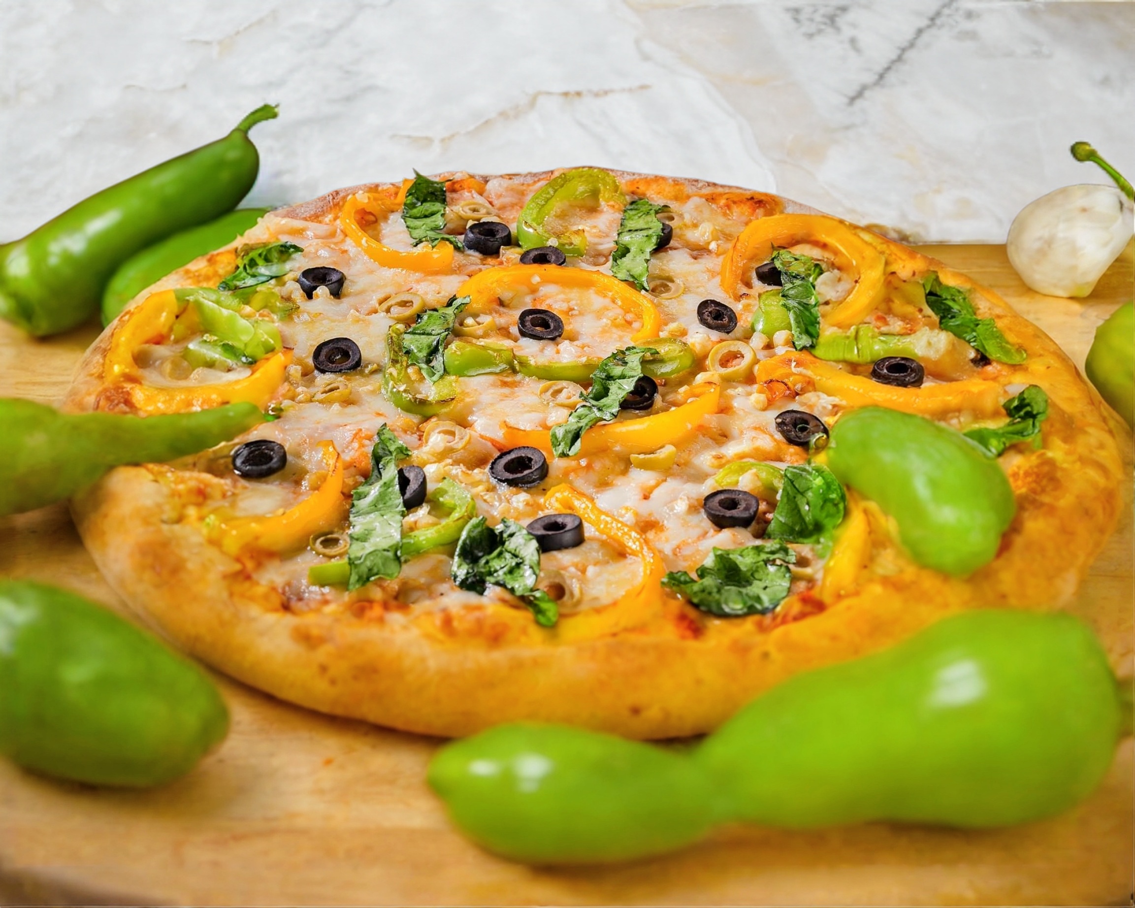 Pimientos, elote, aceituna negra, aceituna verde, espinaca.