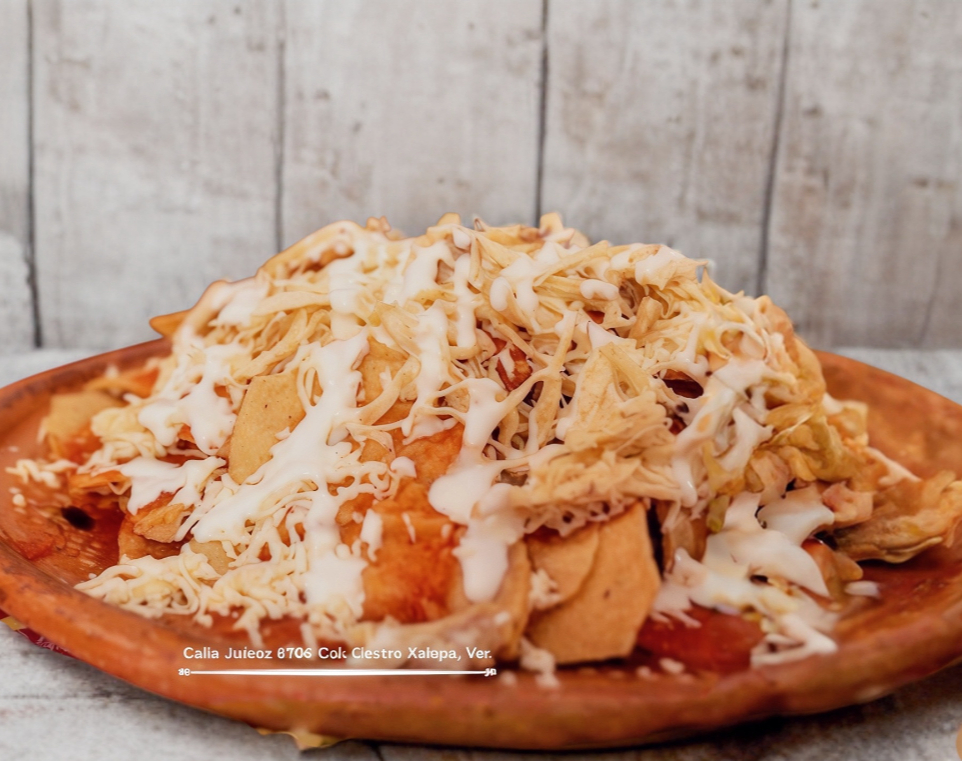 Triangulitos crujientes de tortilla frita bañados con nuestra deliciosa salsa roja habanero para revivirte, coronado con pollo deshebrado, crema y queso fresco