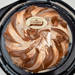 Pan chocolate, mojado en 3 leches, relleno de crema de chocolate con trozos de chocolate europeo, cubierto de nuestra crema de queso y chocolate, decorado con trozos de kínder y milky way.