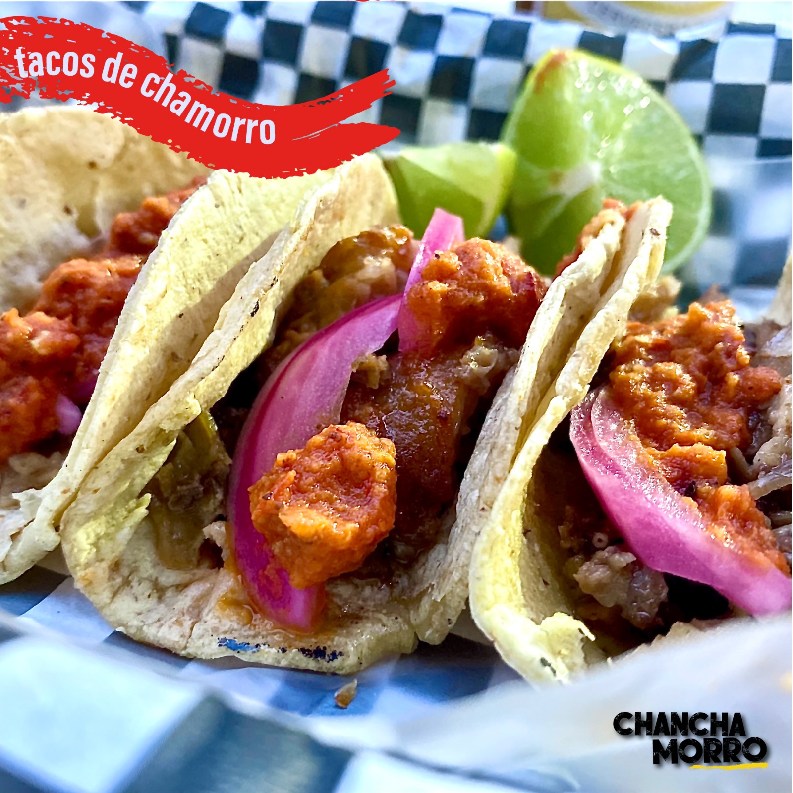 Orden de 5 tacos de tortilla taquera de maíz, cobijando 100 g de carne de chamorro adobado, acompañado con salsa (roja, rosada, BBQ, de la casa) y cebollitas encurtidas.