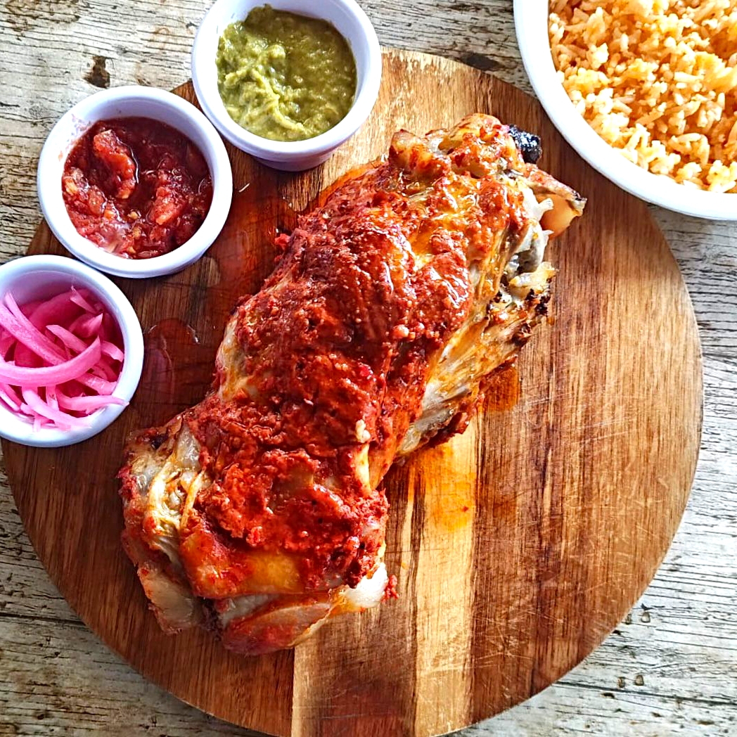 Chamorro sal pimentado horneado acompañamiento a elegir: guarnición arroz o espagueti y tortillas (8 pzs) o telera (2 pzs). se incluye salsa y cebollitas encurtidas.
