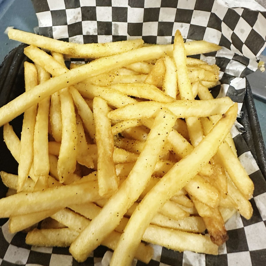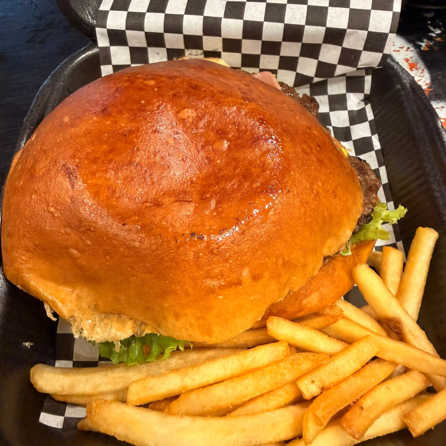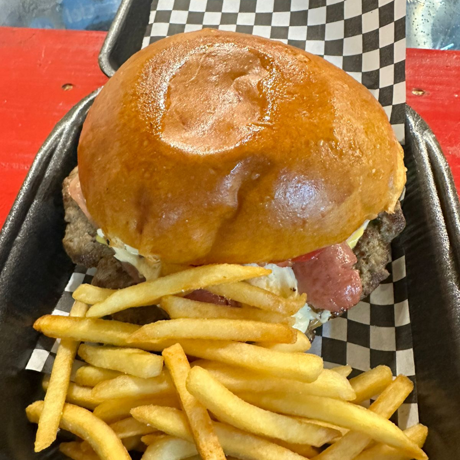Doble carne de res 1/4 de libra, 2 aros de cebolla, 2 rebanadas de tocino, rebanadas de chiles toreados y bañada en salsa BBQ y papas.
