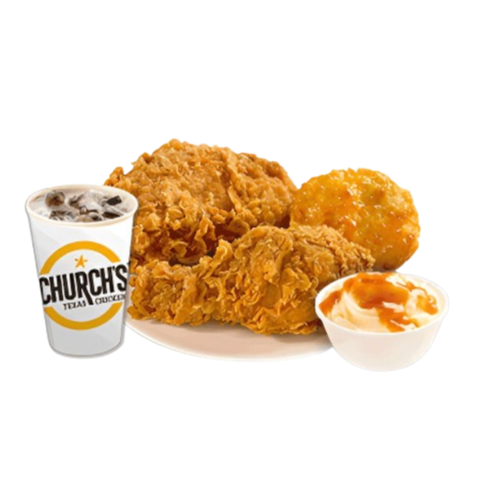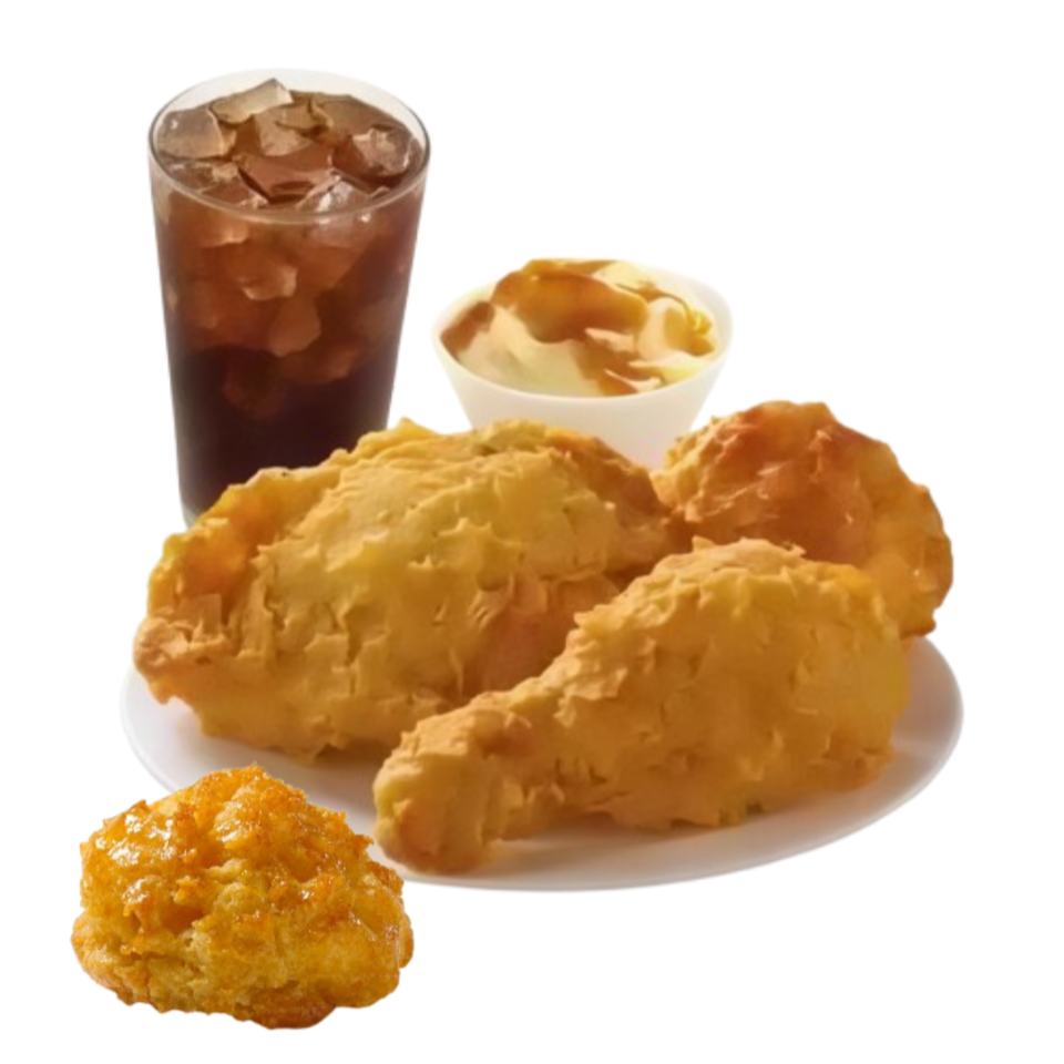 3 piezas de pollo (muslo y pierna), 1 complemento mediano (6oz) a elegir (puré o ensalada), 1 biscuit y 1 refresco (400ml)