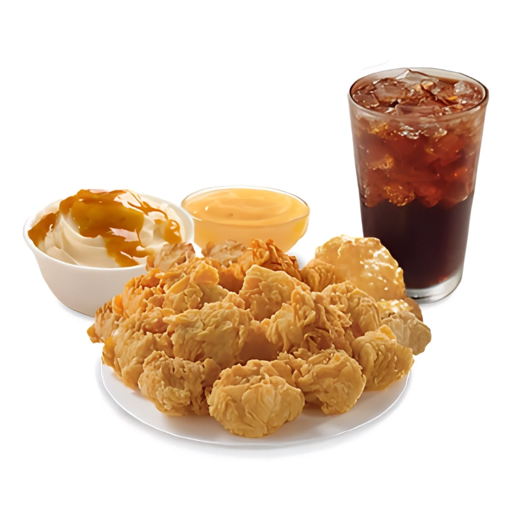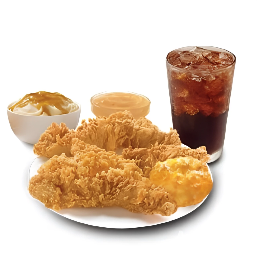 4 tenders (tiras de pechuga de pollo), 1 complemento mediano (6oz) a elegir (puré o ensalada), 1 biscuit y 1 refresco (400ml)