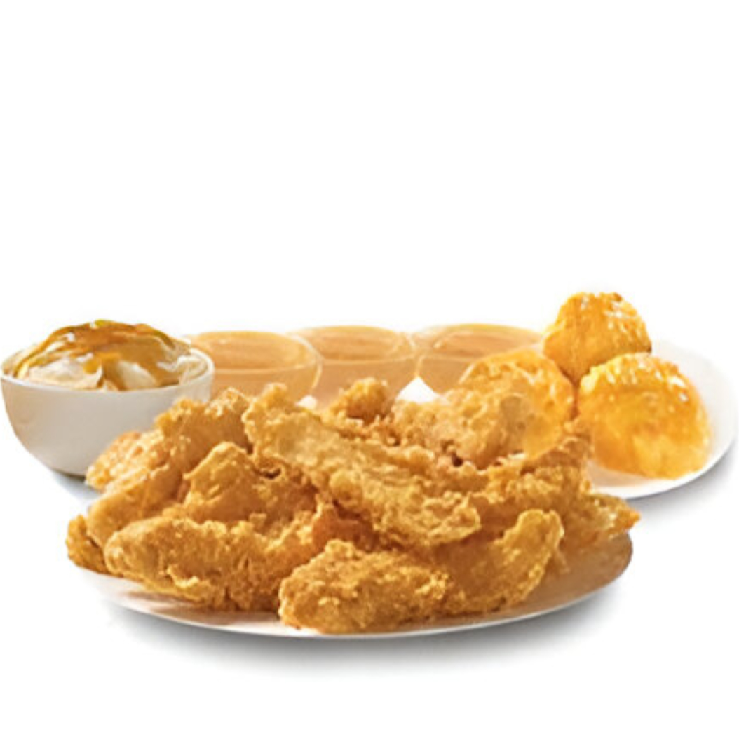 10 tenders (tiras de pechuga de pollo), 1 complemento familiar (16oz) a elegir (puré o ensalada), 3 biscuits y 3 aderezos a elegir (jalapeño o bbq)