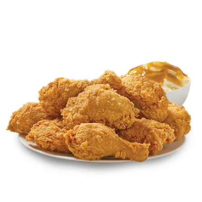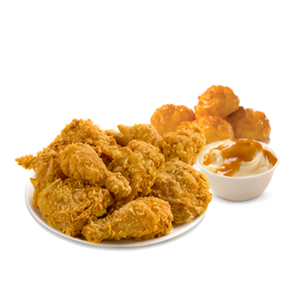 10 piezas de pollo (muslo y pierna), 2 complementos familiares (16oz) a elegir (puré o ensalada) y 5 biscuits