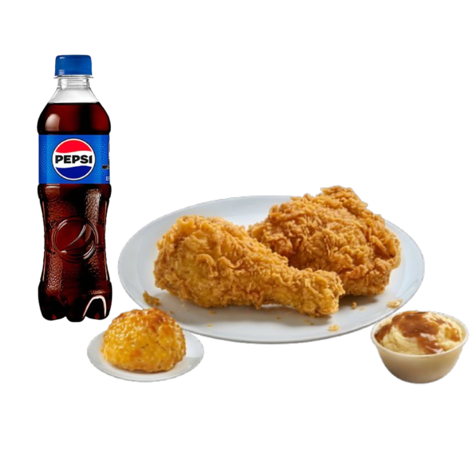 2 Piezas de pollo, 1 biscuit, 1 puré chico (4oz) y 1 refresco (400ml)