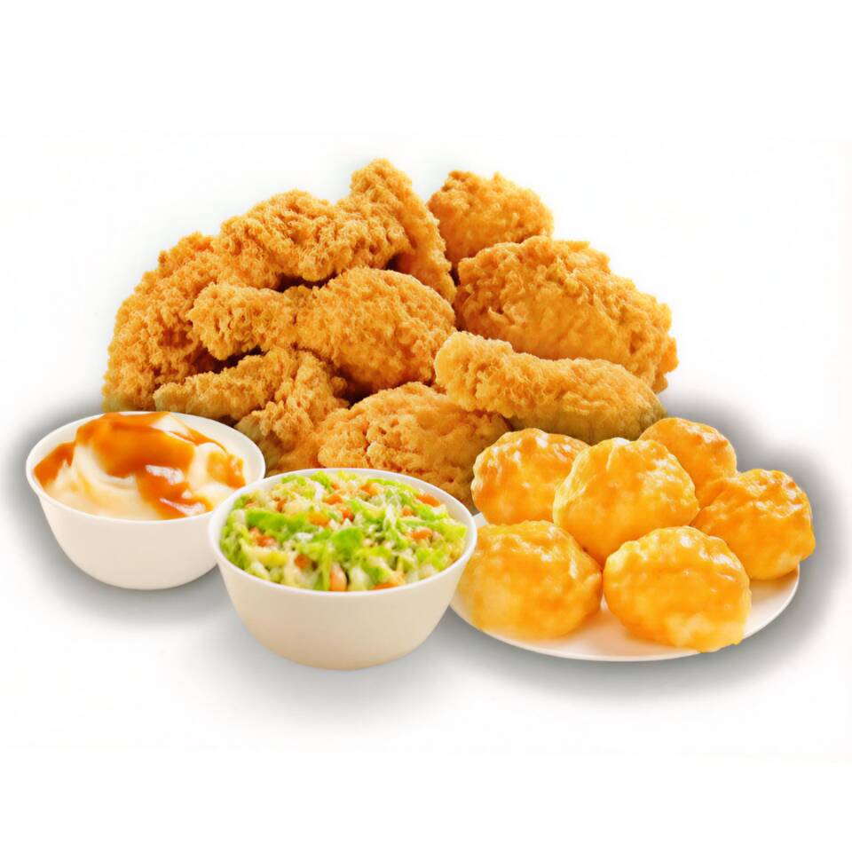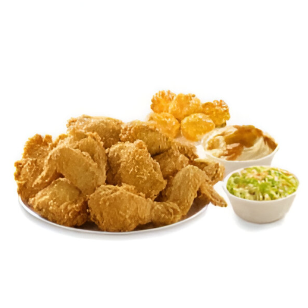 20 piezas de pollo (muslo y pierna), 2 complementos familiares (16oz) a elegir (puré o ensalada) y 6 biscuits