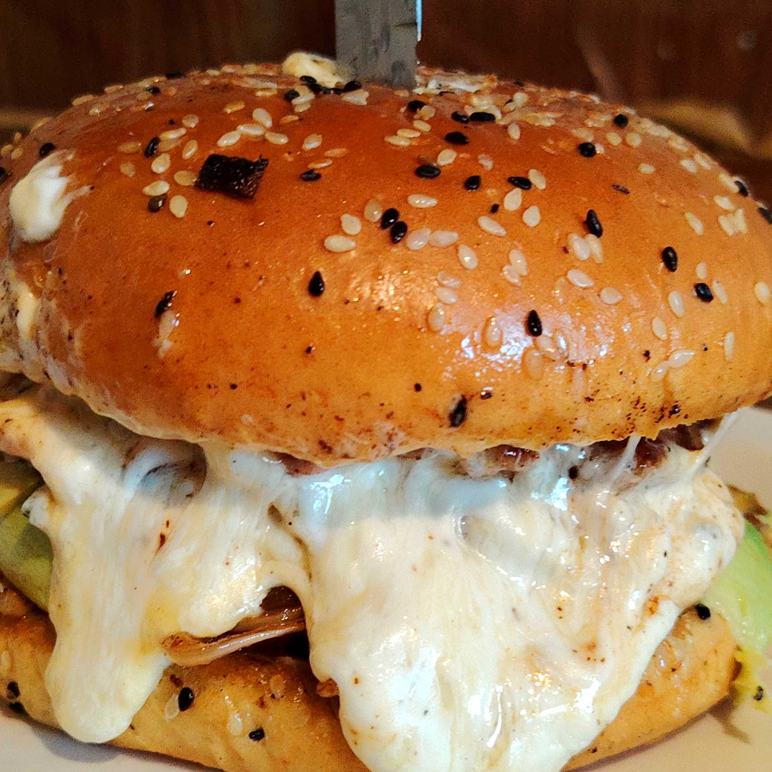 Pan artesanal, carne de res, mix de queso, tocino, champiñones, mayonesa, cátsup, mostaza.