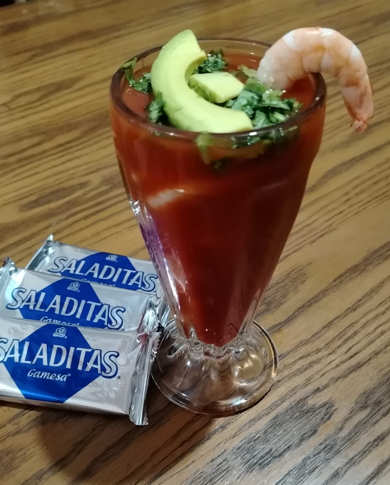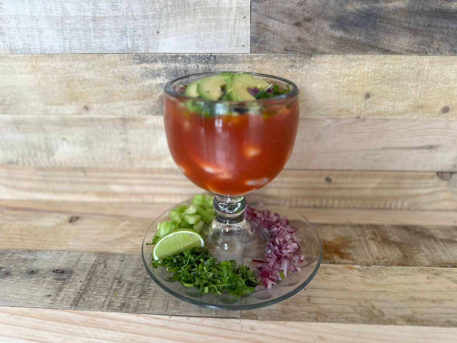 140 gramos de camarón más jugo de cóctel, aceite de oliva, cilantro, cebolla morada, aguacate, limón, salsa habanera y galletas saladas.