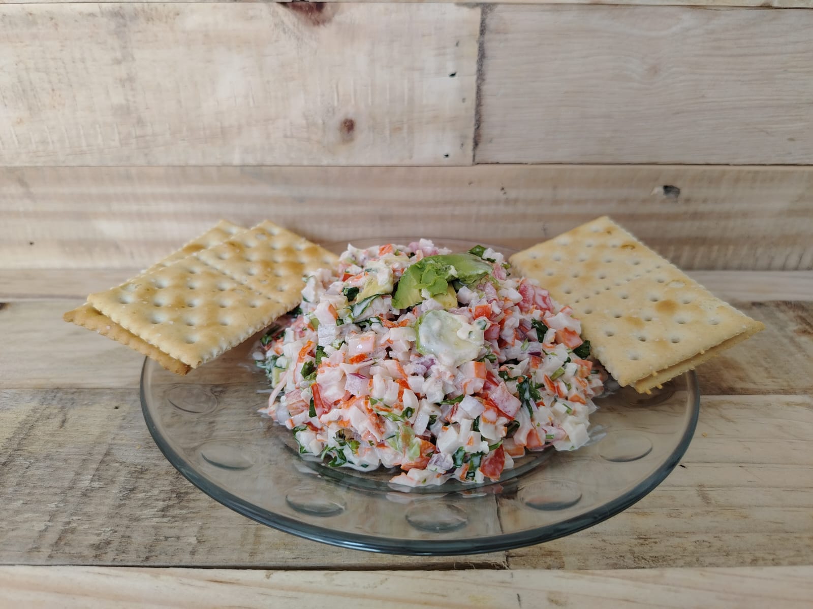 Surimi con jitomate 🍅, cebolla 🧅, cilantro, aguacate 🥑 y mayonesa acompañado de galletas saladas.