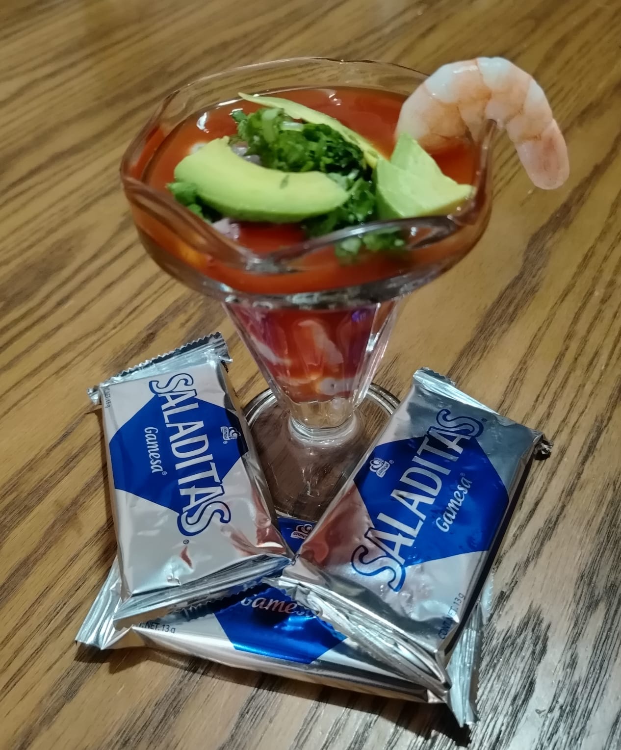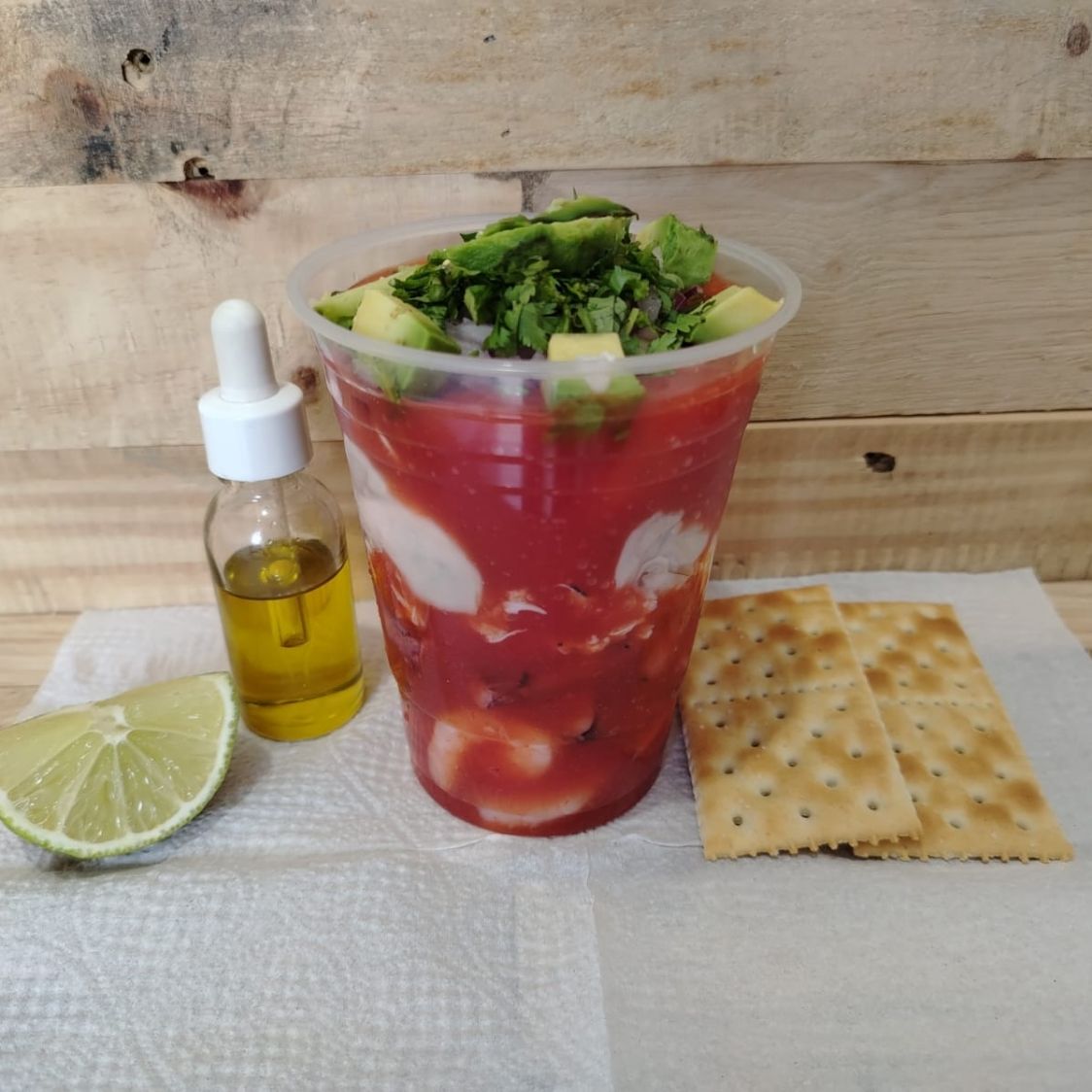 100 gramos de camarón más jugo de cóctel, aceite de oliva, cilantro, cebolla morada, aguacate, limón, salsa habanera y galletas saladas.