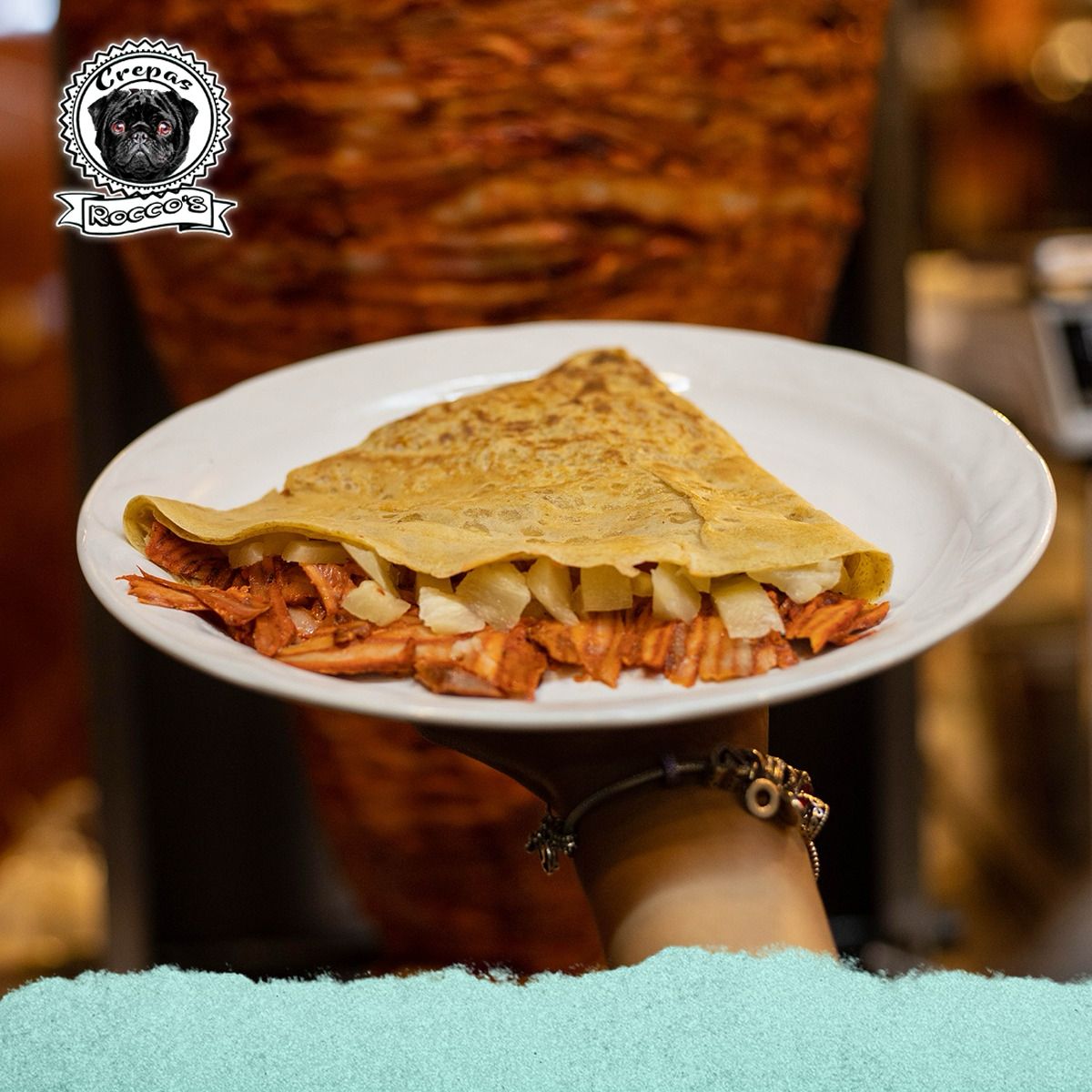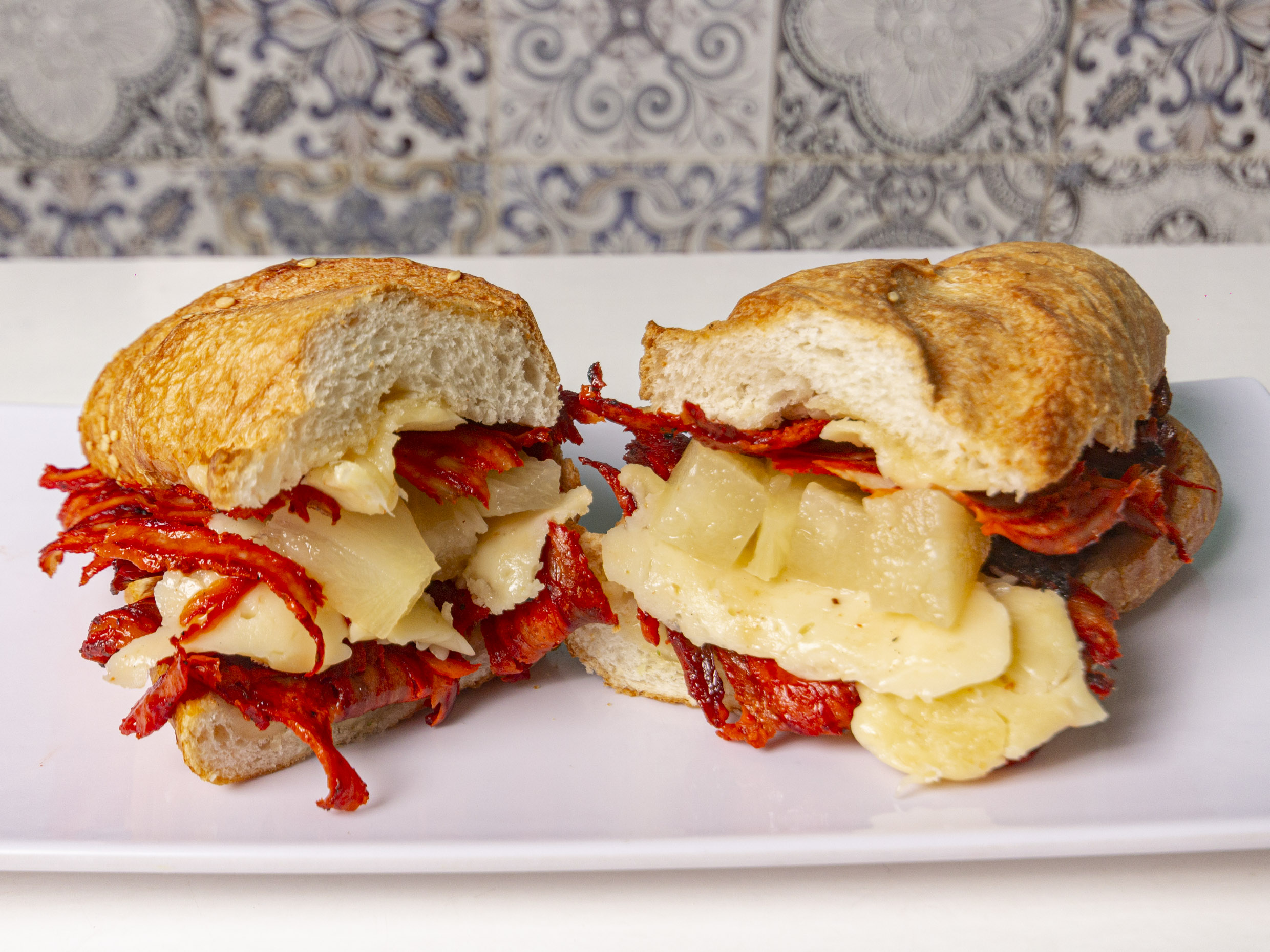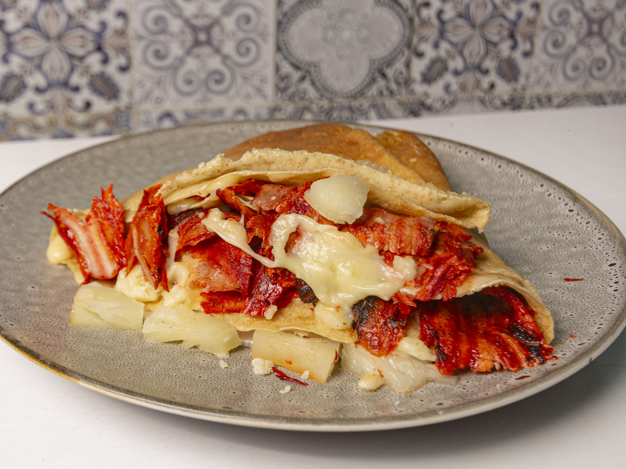 Pan, carne al Pastor, queso manchego y piña