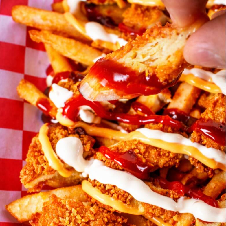 PAPAS FRITAS*1 + ADEREZO RANCH*1 + ADEREZO QUESO CHEDDAR*1 + ADEREZO BBQ*1 + TIRA CRUJIENTE DE PECHUGA DE POLLO*2