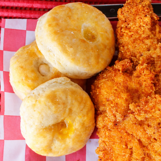 TIRA CRUJIENTE DE PECHUGA DE POLLO*4 + MINI BISQUETS 2 PIEZAS*1 + ADEREZO RANCH*1 + PURE DE PAPA CHICO*1 + ADEREZO BBQ*1
