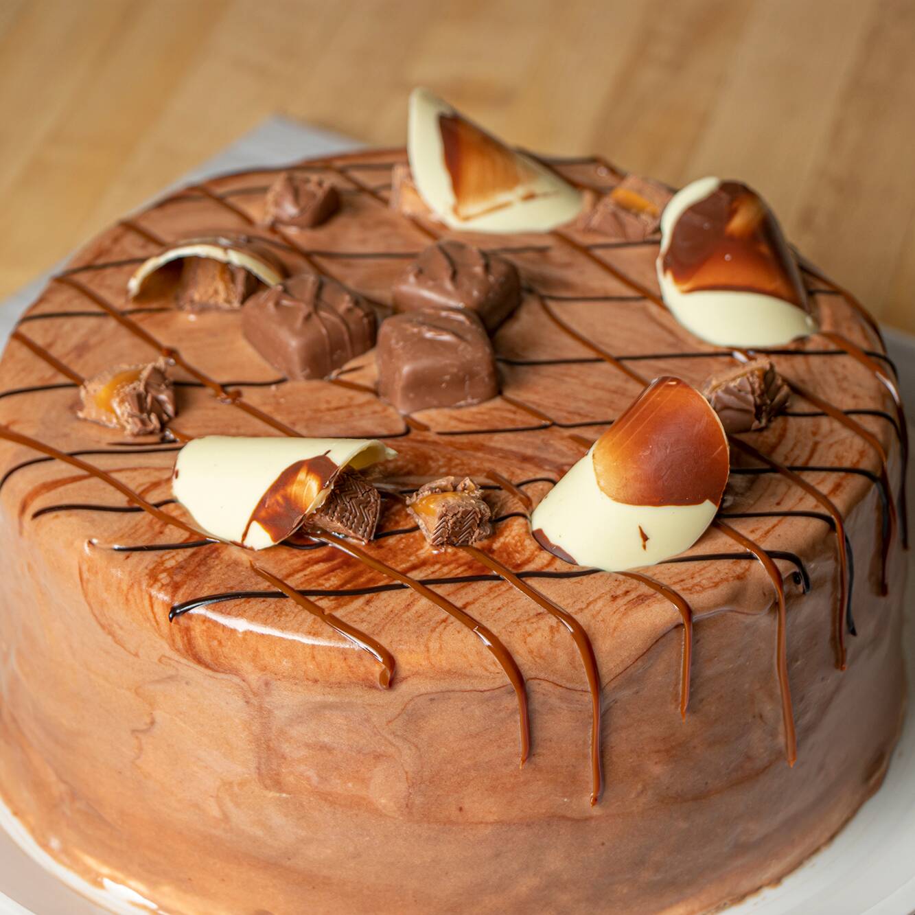 Pan De Chocolate Relleno De Crema De Queso Con Milky Way. 3 Leches De Chocolate. Decorado De Chantilly Chocolate Con Ganache, Chocolates Milky Way Y Garabatos De Dulce De Leche.