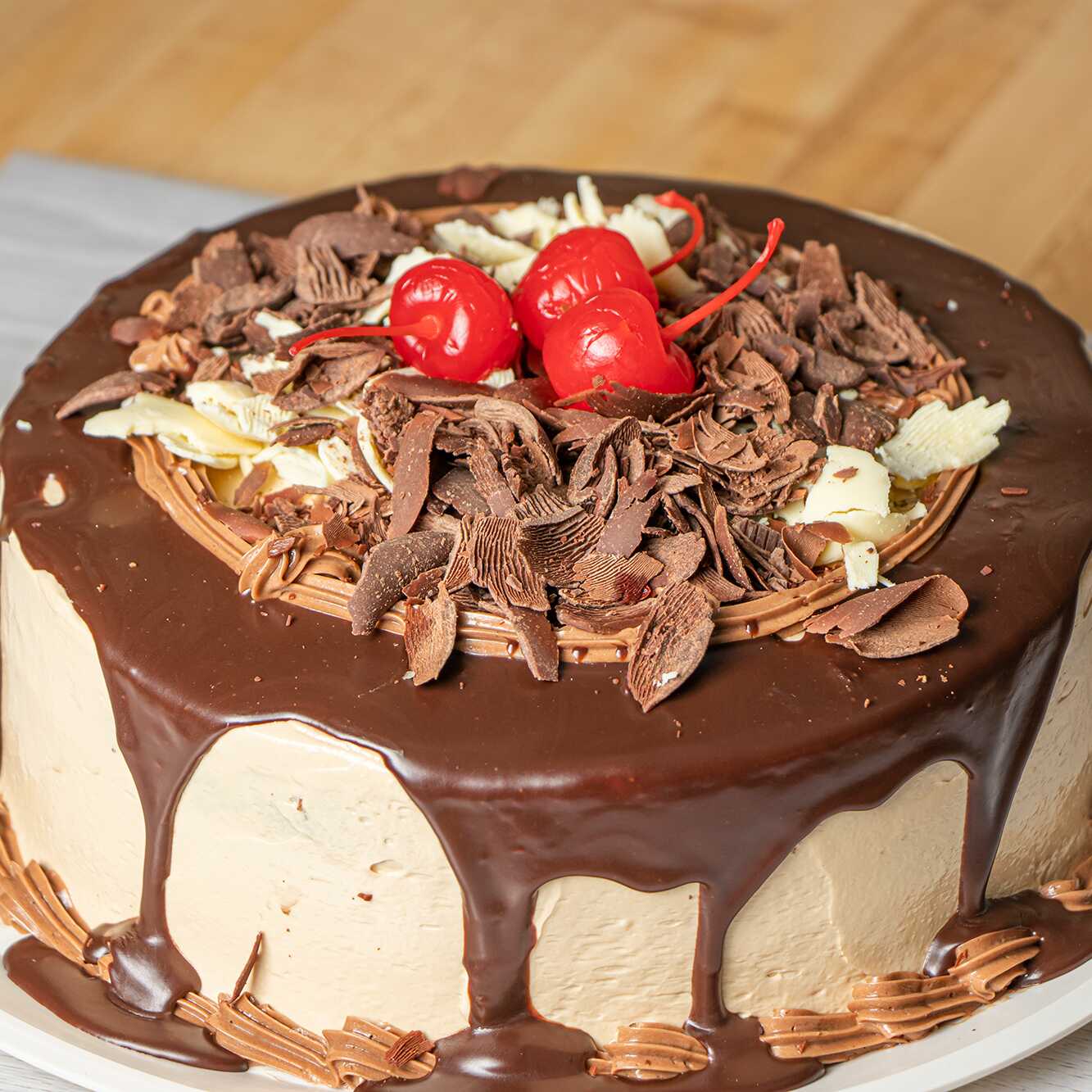 Pan De Chocolate Relleno De Nuez. 3 Leches De Chocolate. Decorado Con Cremaquilla Chocolate Y Hojuelas De Chocolate Blanco
