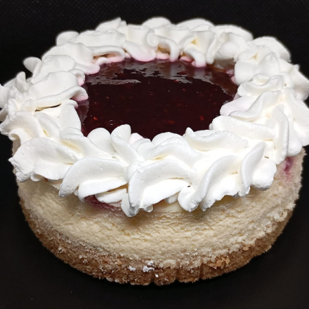 Cheesecake horneado, cremoso sabor vainilla con un toque de limón,con topping de salsa casera de frutos rojos y chantilly (porción individual).