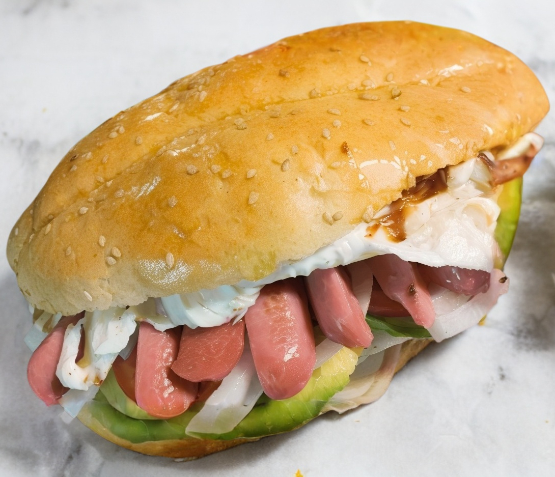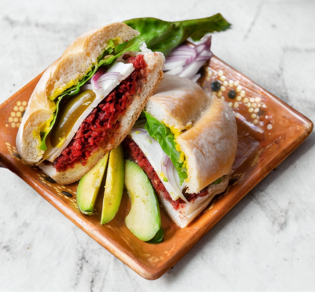 Jamón, frijoles, mayonesa, tomate, aguacate y queso oaxaca o hebra.