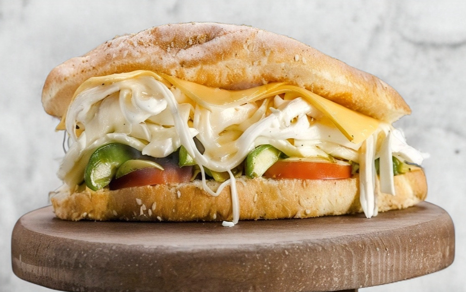 Queso de hebra a la plancha, tomate, aguacate, mayonesa y frijoles.