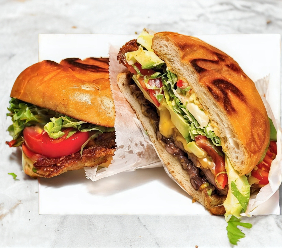 Una Torta tamaño regular Milanesa de pollo, jamón, queso de hebra, mayonesa, jitomate, aguacate y frijoles.