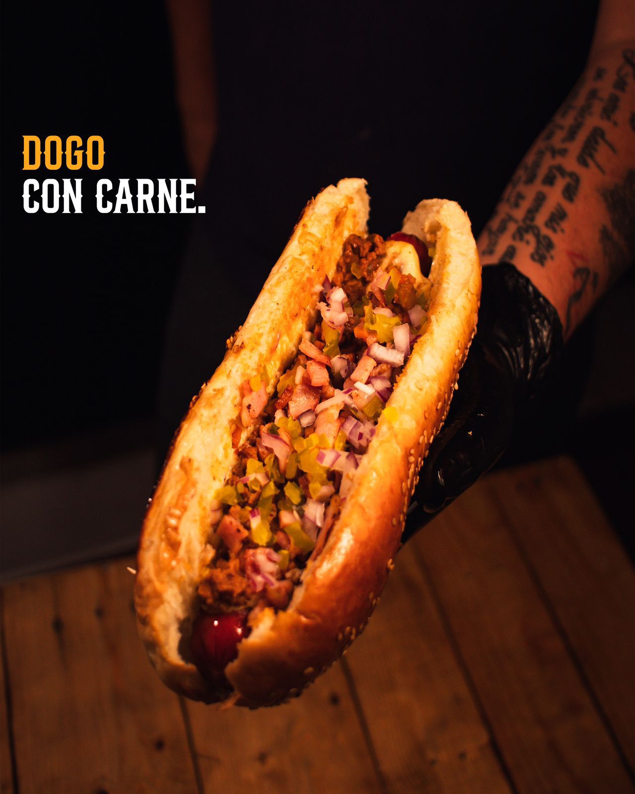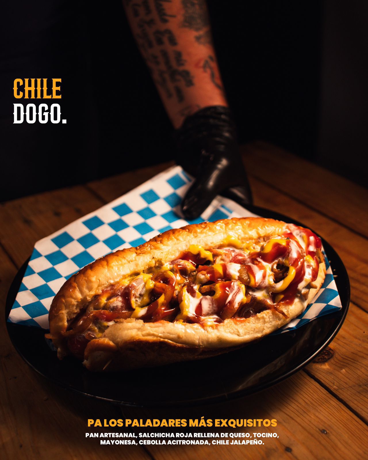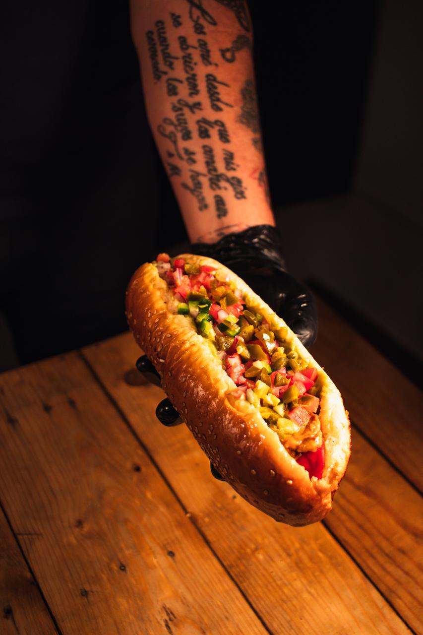 Pan artesanal, chile, salchicha, tocino, mayonesa, queso Oaxaca, champiñones, capsut, mostaza, cebolla citronada.