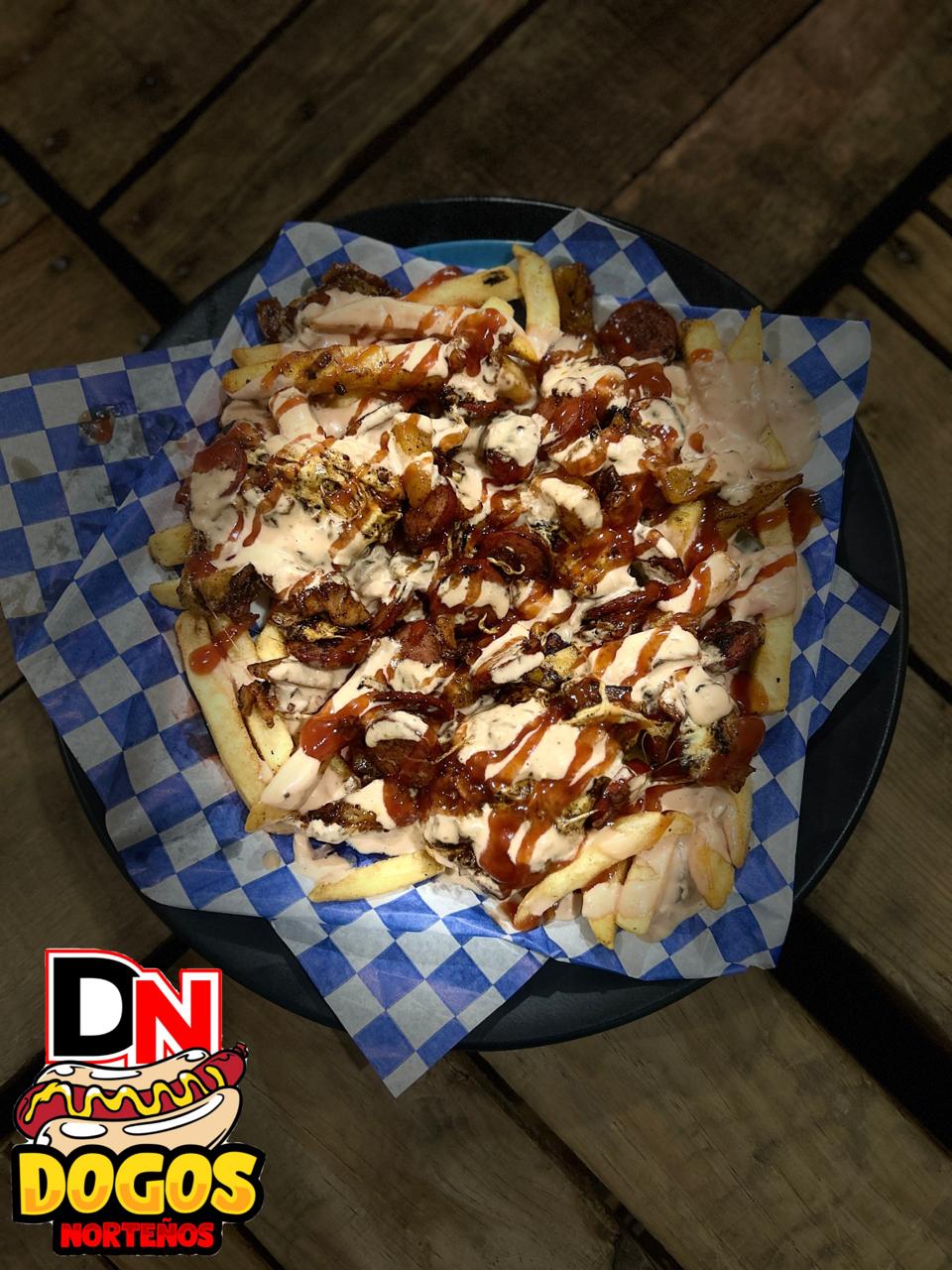 Papas francesa, salchicha de res, tocino, piña, queso oaxaca, aderezo de la casa y chile seco