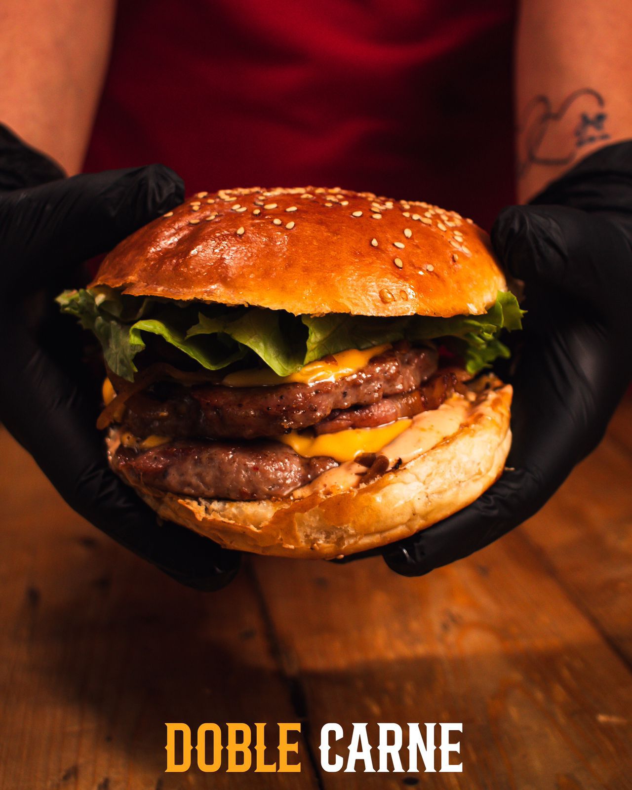 Pan, aderezo de la casa, lechuga, tomate, tocino, cebolla acitronada, queso americano, dobles carne, mayonesa.