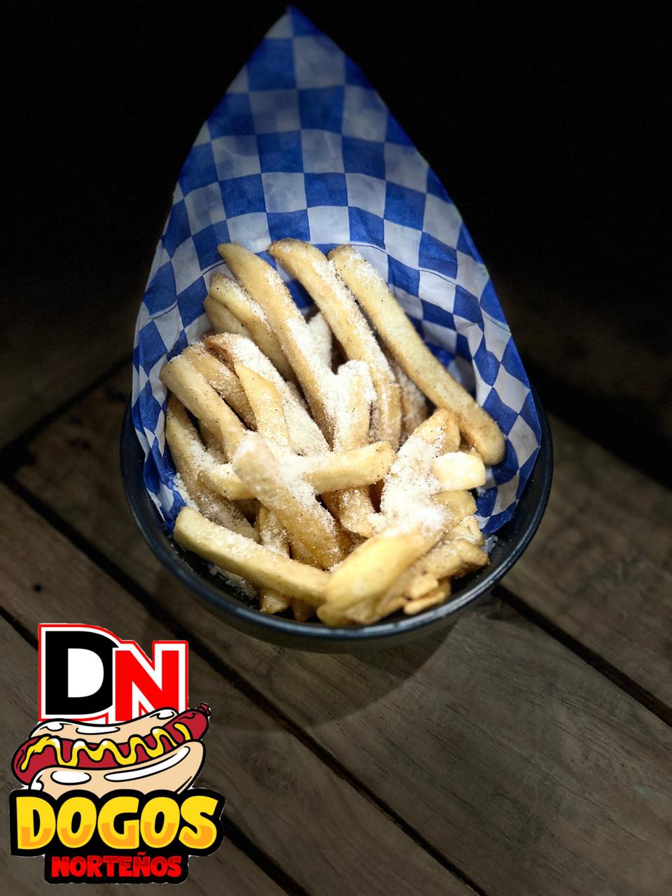 Papas francesa fritas con sal, espolvoreadas con queso parmesano