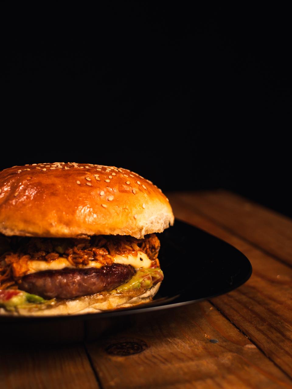 Pan, aderezo de la casa, lechuga, tomate, cebolla morada, queso americano, carne y mayonesa.